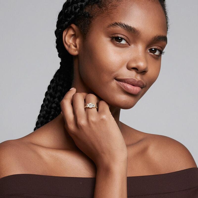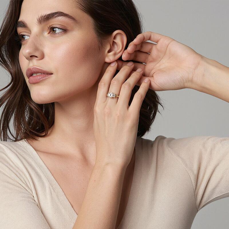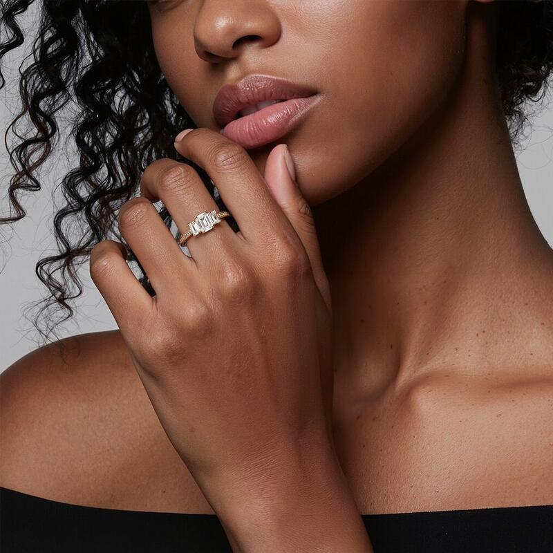 Exuding timeless elegance, this three-stone ring features an emerald-cut center stone flanked by two matching side stones. The trio of gems creates a stunning visual harmony, while the shank, adorned with round small gems, adds an extra layer of brilliance. As a symbol of a journey shared, this ring mirrors the past, celebrates the present, and anticipates a future filled with love and commitment.