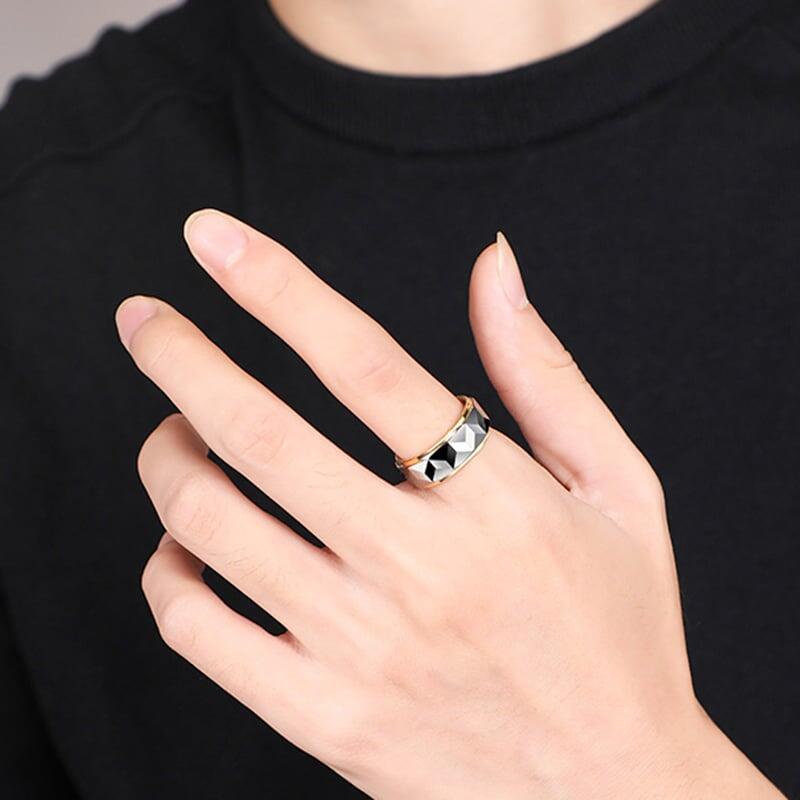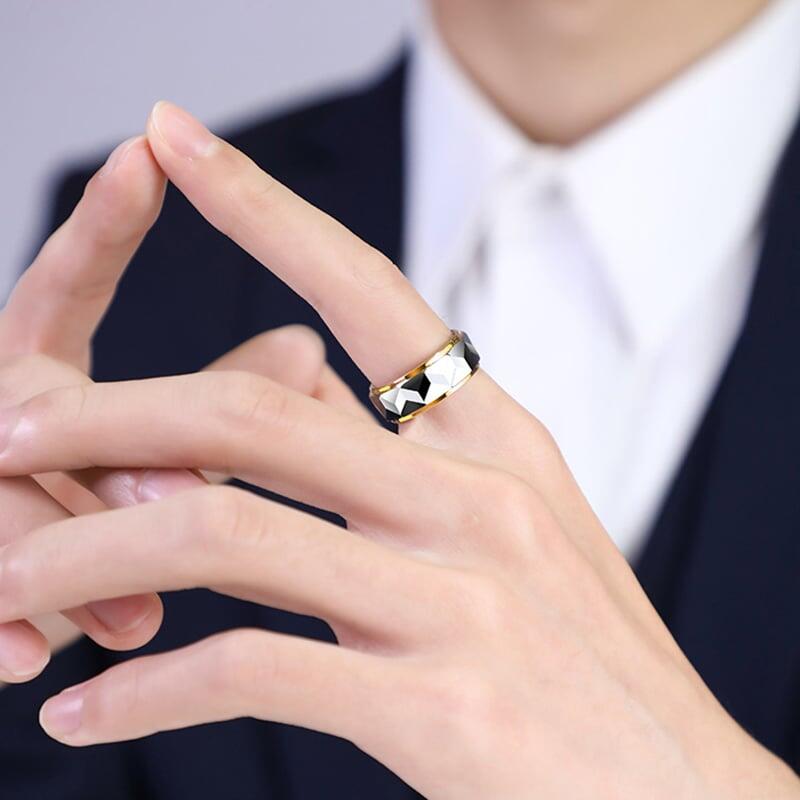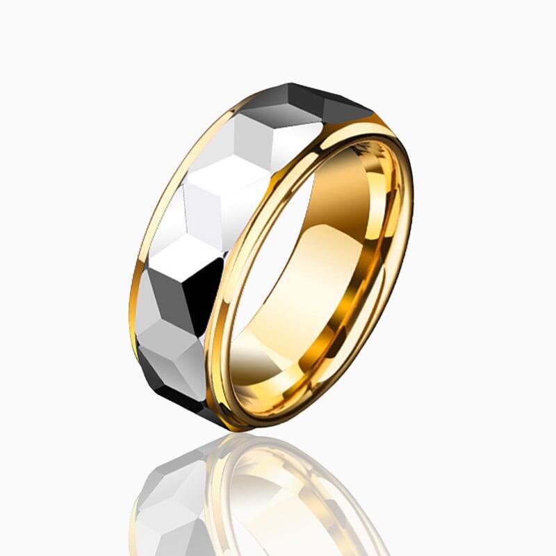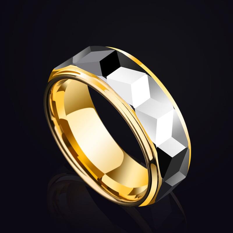 A modern masterpiece of contrasts, this men's wedding band pairs a gleaming gold-plated tungsten carbide base with a bold, silver-toned geometric faceted surface. The precision-cut facets create a striking interplay of light and shadow, while the sharp step edges add architectural depth for a sleek, masculine aesthetic.