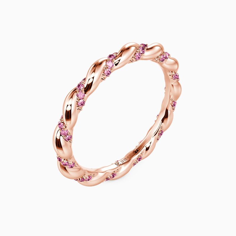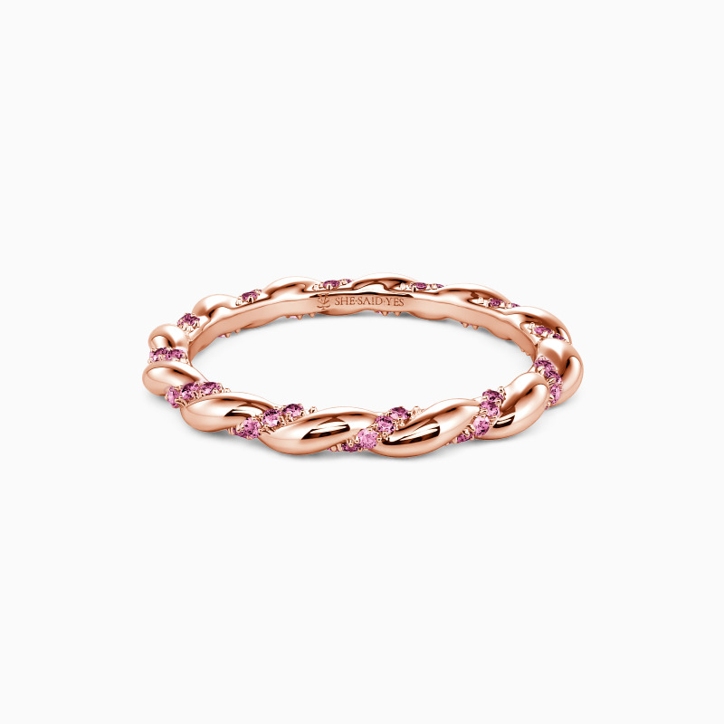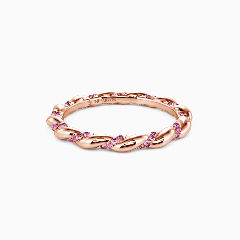 This wedding band glimmers as a standout piece. It radiates sophistication, formed by the syncing of two elegant ribbons, one polished metal and one glittering with gems. When worn individually or alongside a partner, its intricate design ensures all eyes will be drawn to its finely crafted details and balanced, intertwining composition.