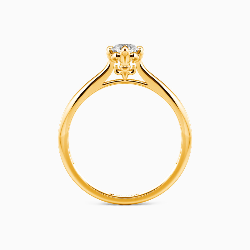Classical and graceful. Held by the elegant setting of the fleur-de-lis, the round-cut center gem shimmers its own brilliance on the polished tapered shank. With the different widths of the shank, this solitaire ring with timeless glisten will stretch your finger and create an unforgettable memory for everyone in love.