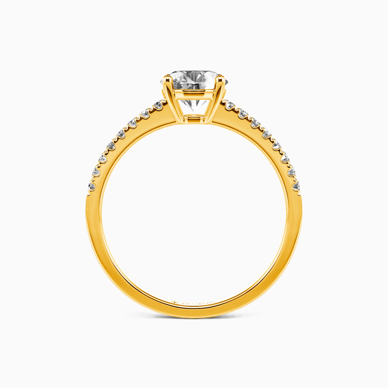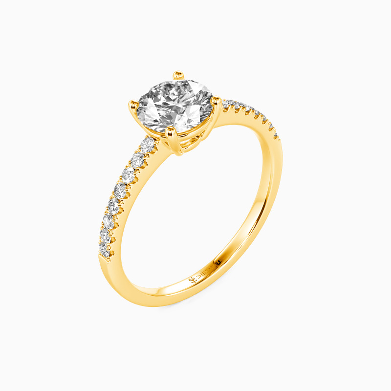Simple and classic. A graceful engagement ring featuring a glistening Round stone in the setting with a gold contrast around the main stone. Additional accents line the gold band. This one pair nicely with a multitude of our wedding bands. Promise to love her with this ring as long as the stars twinkle in the sky, as long as angels are there up high.