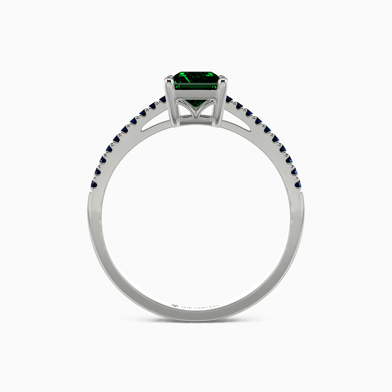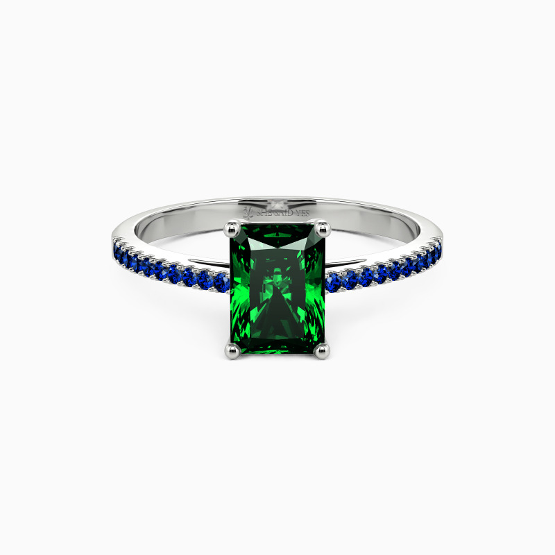 Elegant and elaborate. As the idealist type to enhance her incredible charm, this side stone ring is the best option to accentuate the dazzling glamour of the radiant-cut center stone. Adorned with the shimmering gems pave shank, this ring will make a striking impression on your perfect wedding.