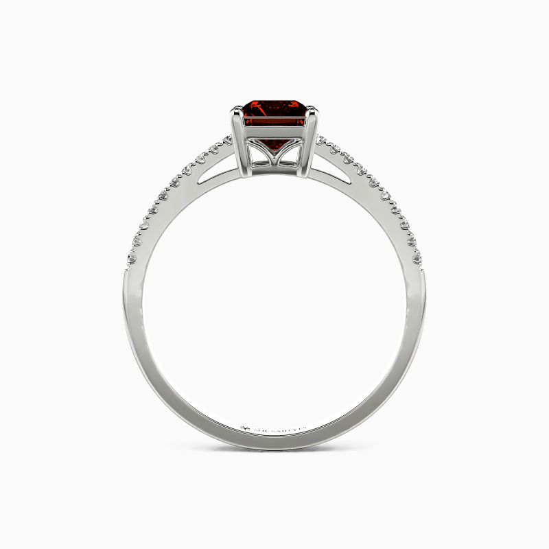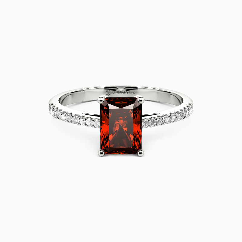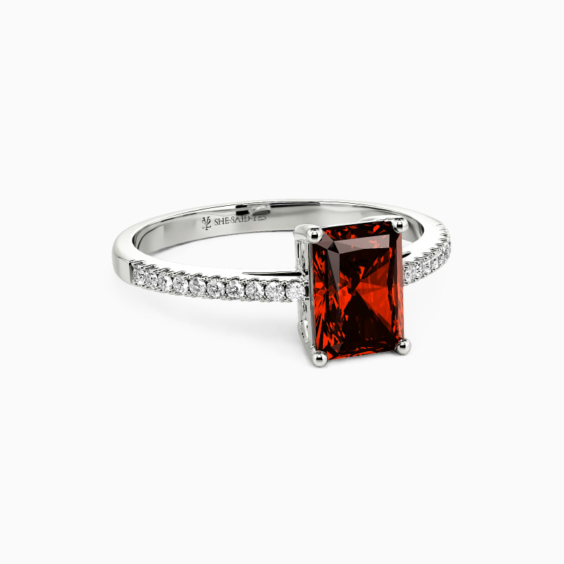 Elegant and elaborate. As the idealist type to enhance her incredible charm, this side stone ring is the best option to accentuate the dazzling glamour of the radiant-cut center stone. Adorned with the shimmering gems pave shank, this ring will make a striking impression on your perfect wedding.