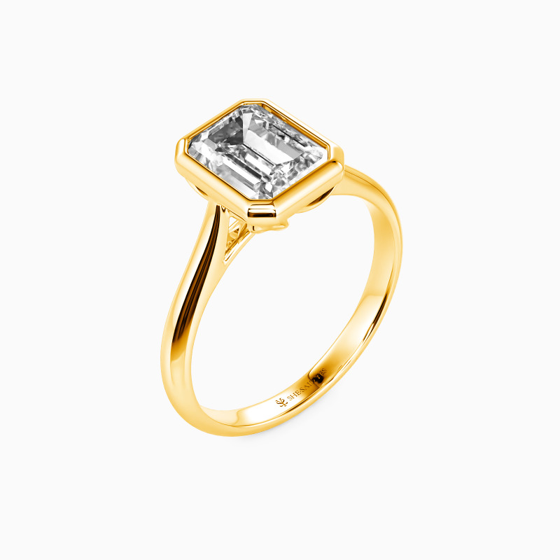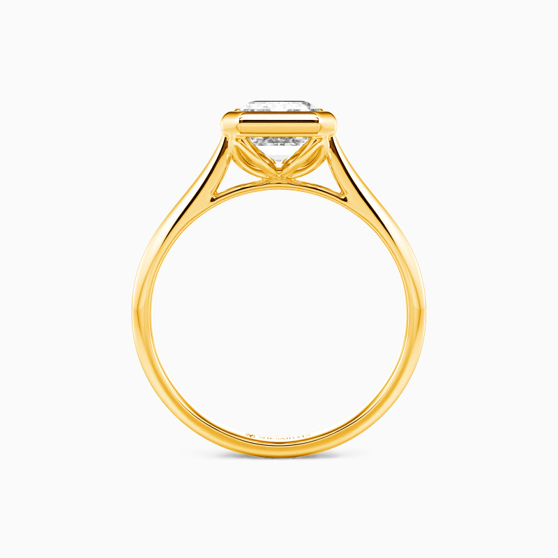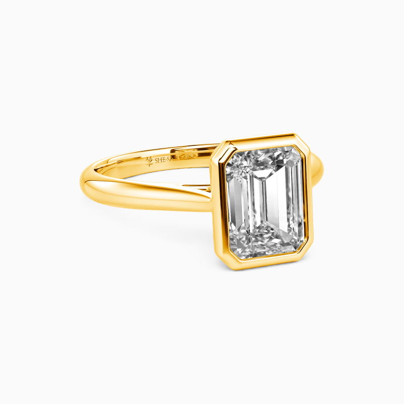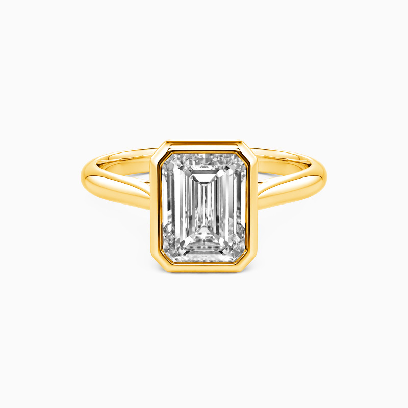 Epitomizing minimalist elegance, this solitaire engagement ring features an emerald-cut center stone, bezel-set to accentuate its geometric beauty. The clean lines of the setting allow the gem to take center stage, radiating with unmatched brilliance. The tapered shank, subtly refining the design, complements the stone perfectly. This ring is a testament to the power of simplicity, ideal for those who find beauty in understated sophistication.