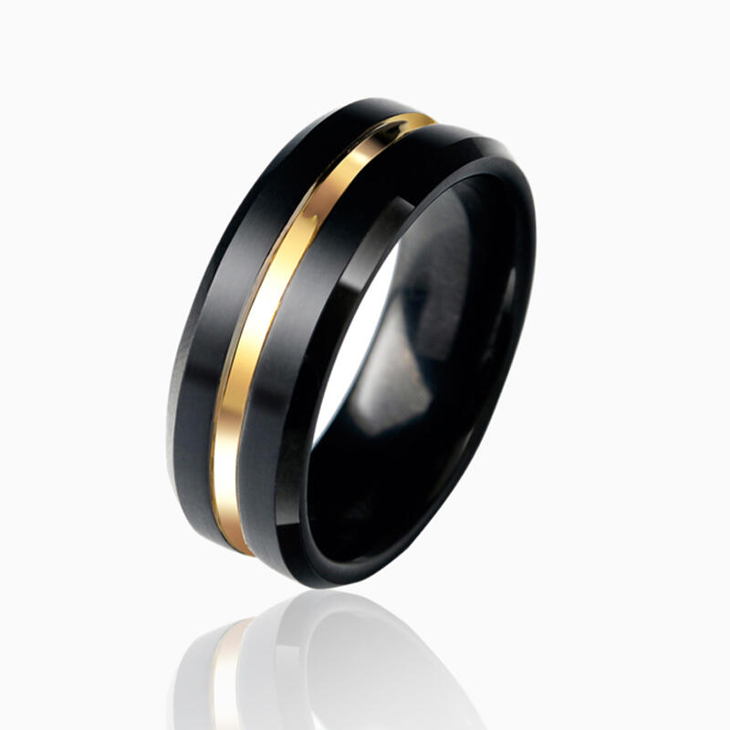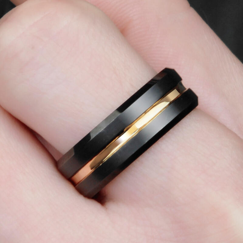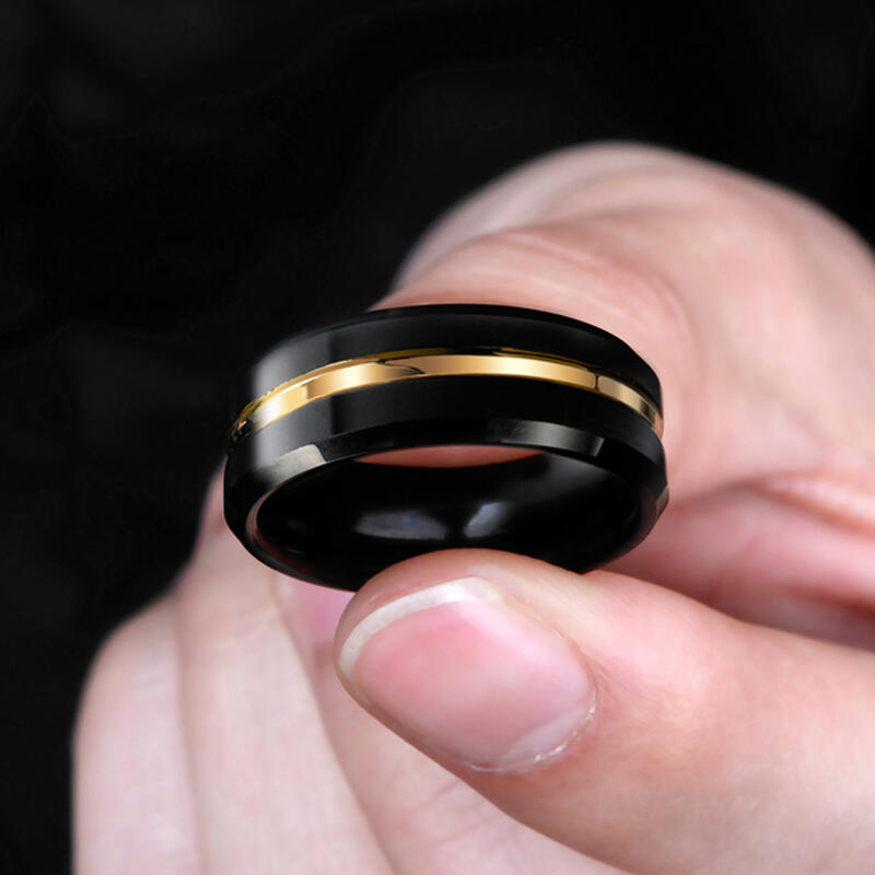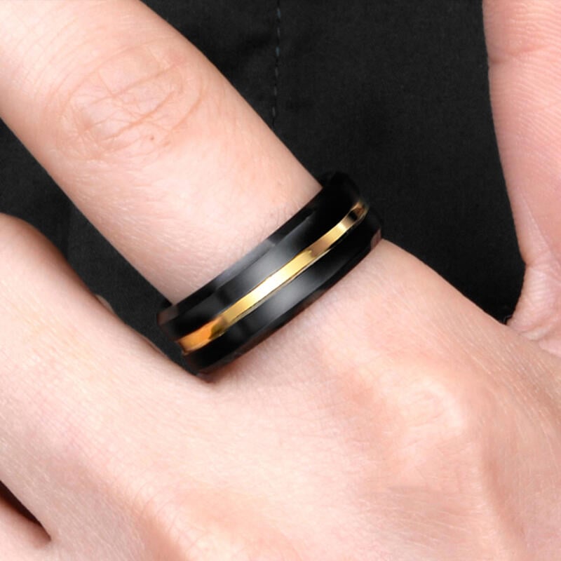 This bold men's wedding band pairs a matte black tungsten carbide base with a gleaming gold center channel for striking contrast. The beveled edges add subtle angular refinement, softening the ring's silhouette while maintaining its modern edge. Ideal for those who appreciate minimalist design with a touch of luxe contrast.