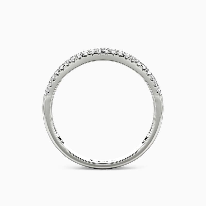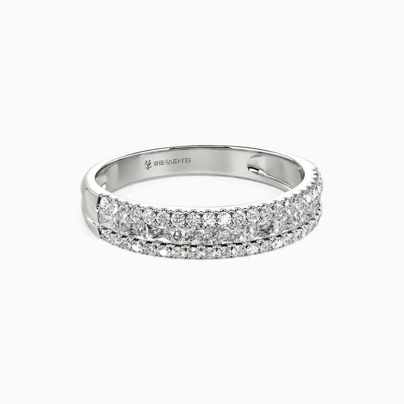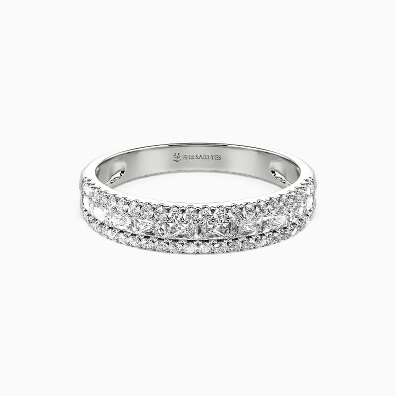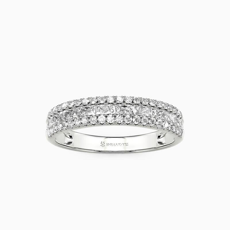 On your special day, this classic wedding band coordinating creates a spectacular ensemble with your engagement ring. A row of emerald-cut stone in a channel setting shines with two rows of surrounding round-cut stones. The brilliance of this beauty will light up your hand and glamour. Show off your high voltage sparkle with this classic band.