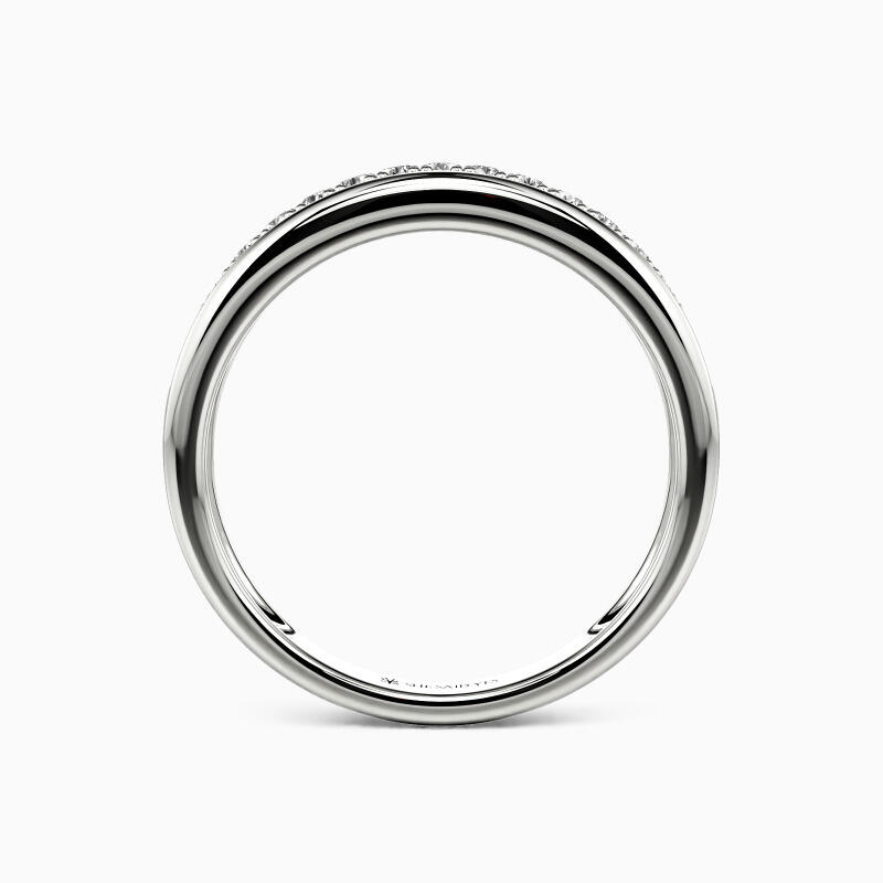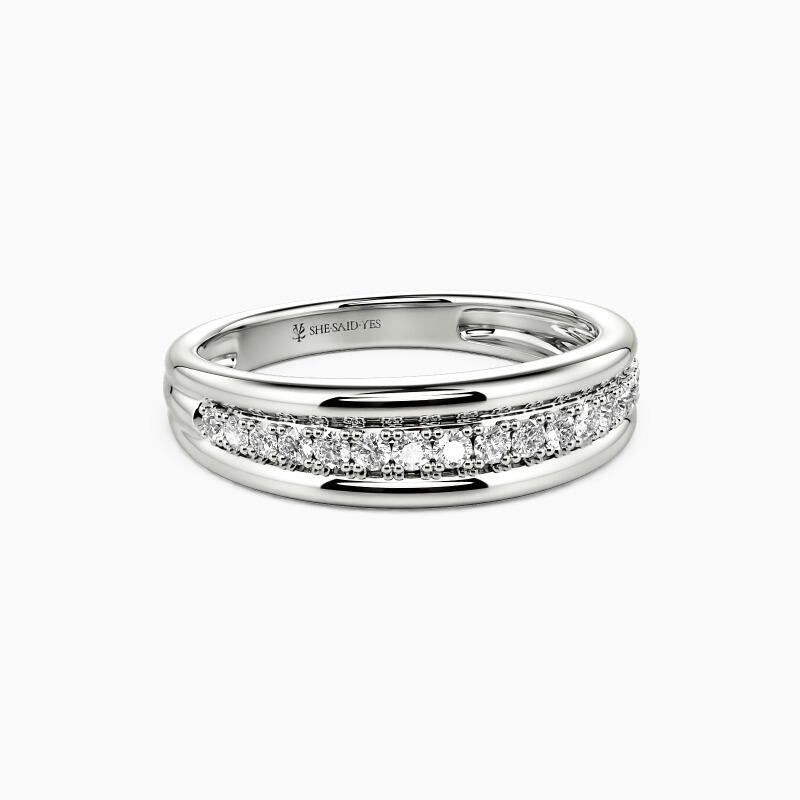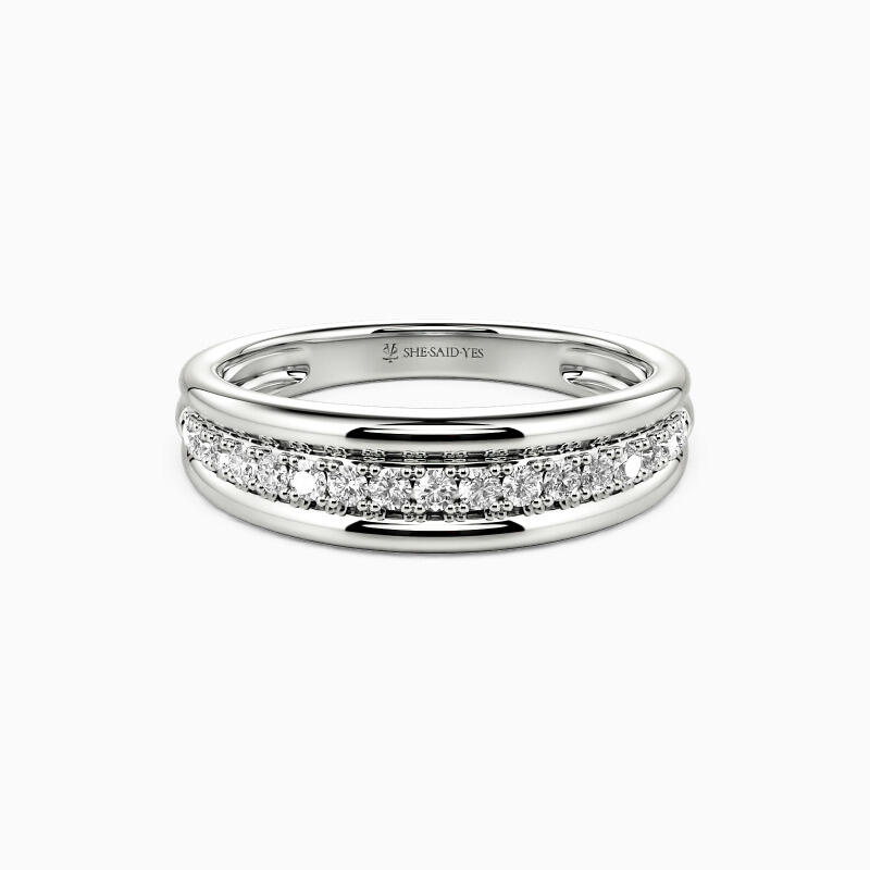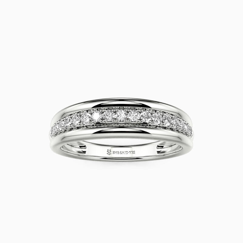 A distinguished wedding band he'll treasure. This style showcases a row of pavéd round-cut stones glistening across the center. And the polished borders complete the sparkling design. It is certain to be a perfect choice for the man you adore.