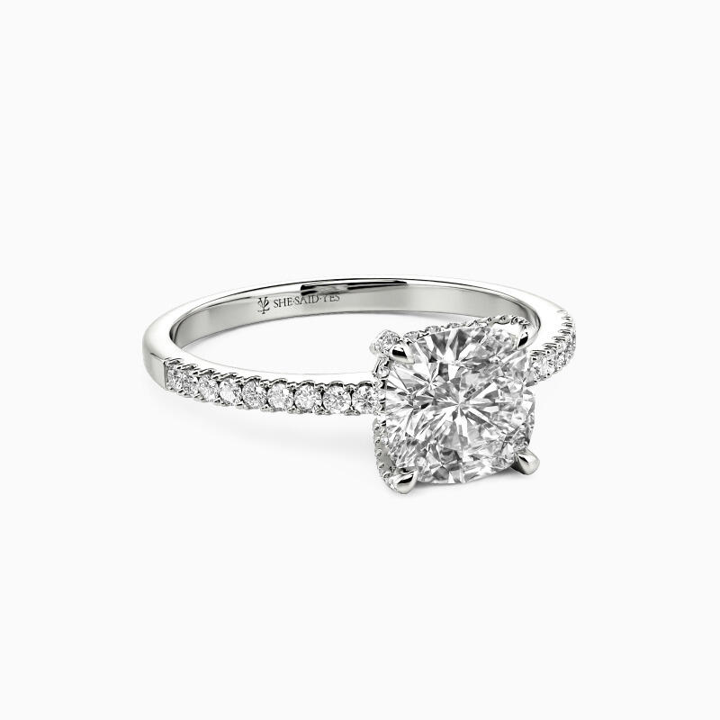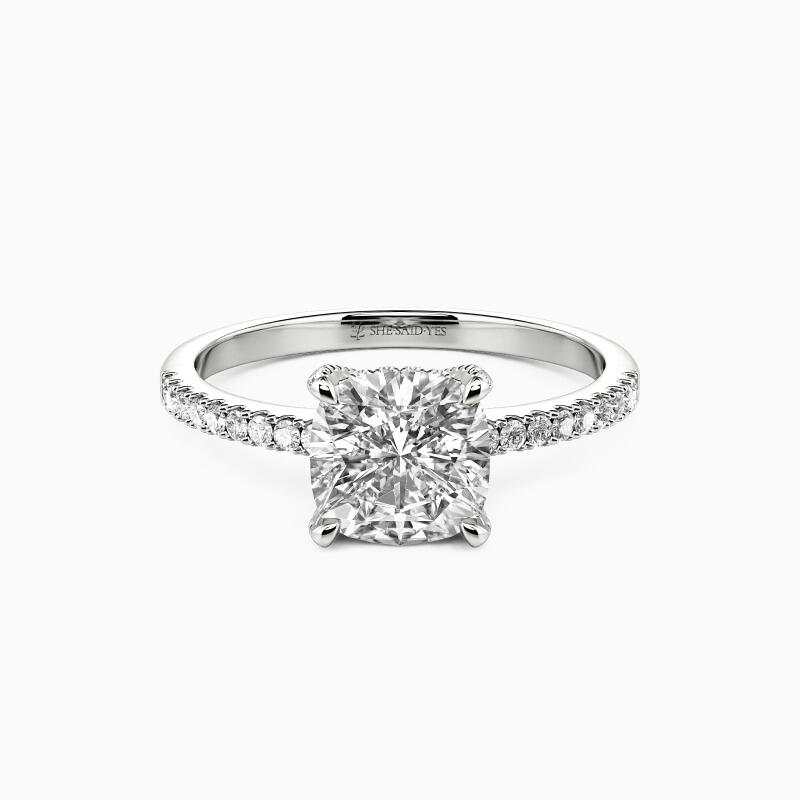 A unique design of the head makes this side stone engagement ring look so different. The scintillating cushion-cut center stone is held in four claws which were decorated with brilliant accents. And a string of tiny shining round shaped stones aligned in a pavé setting offers you impeccable elegance. Hold her hands and walk by her side every day with this ring.