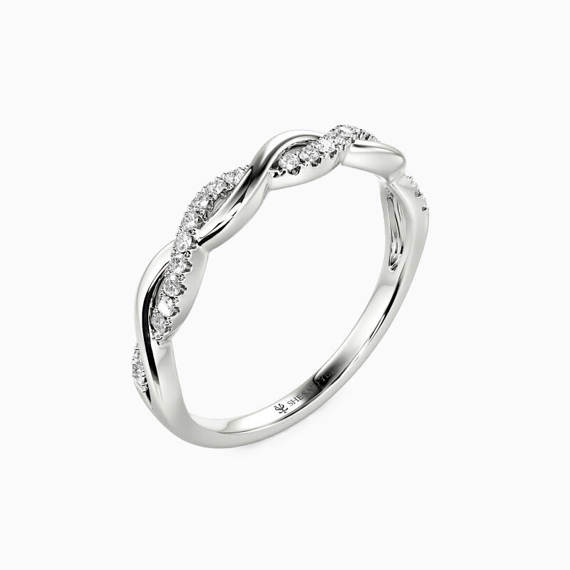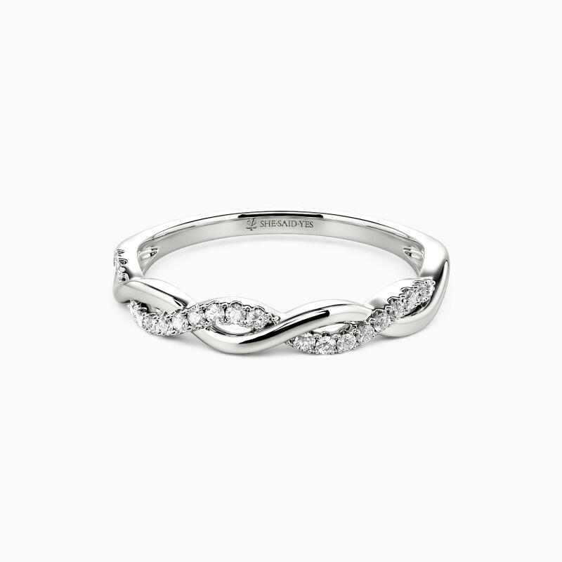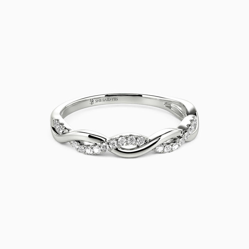 Contemporary design for the chic bride-to-be. This eye-catching wedding band is completed by one shank set with dazzling pavéd stones and the other a highly polished metal finish. They intertwine with each other to create this unique look and witness your exchanged souls. Love is giving freedom, and I promise you to love you all forever.