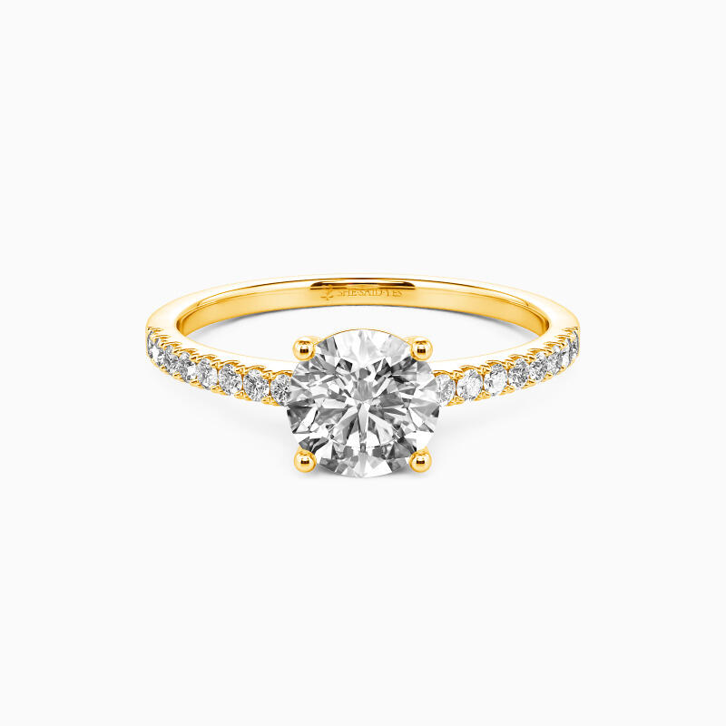 Simple and classic. A graceful engagement ring featuring a glistening Round stone in the setting with a gold contrast around the main stone. Additional accents line the gold band. This one pair nicely with a multitude of our wedding bands. Promise to love her with this ring as long as the stars twinkle in the sky, as long as angels are there up high.