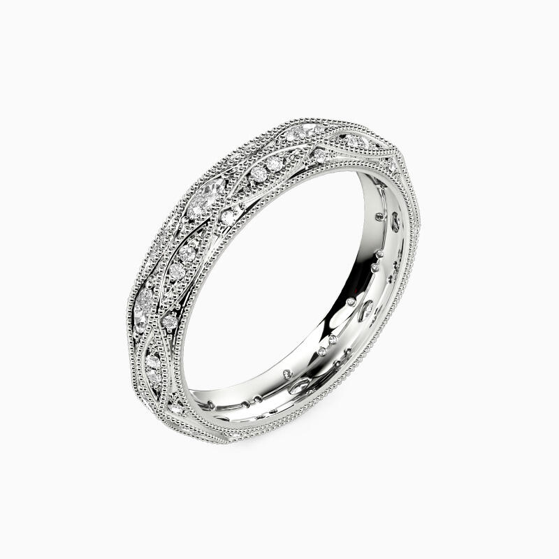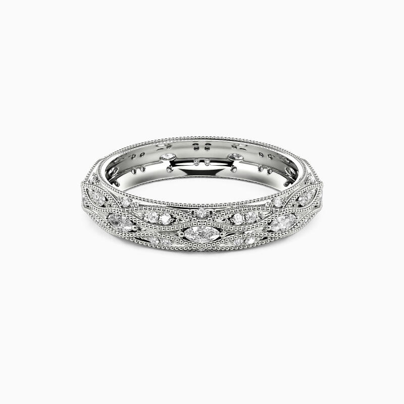 This eternity wedding band features glittering round-cut and marquise-cut alternatively studded on the band to exhibit superlative brilliance. Further enhancing the overall look of this ring is the milgrain borders, making it a gorgeous addition next to your engagement ring or to wear solo.