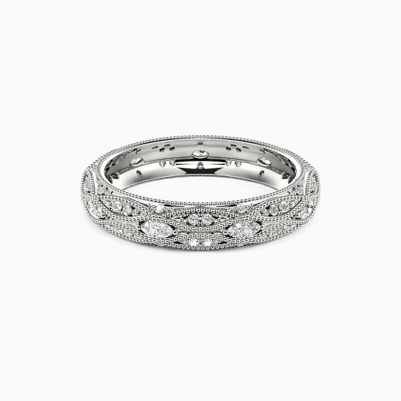 This eternity wedding band features glittering round-cut and marquise-cut alternatively studded on the band to exhibit superlative brilliance. Further enhancing the overall look of this ring is the milgrain borders, making it a gorgeous addition next to your engagement ring or to wear solo.