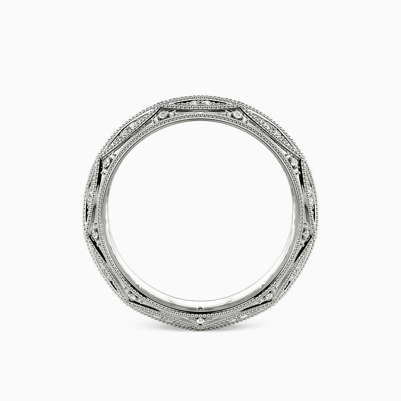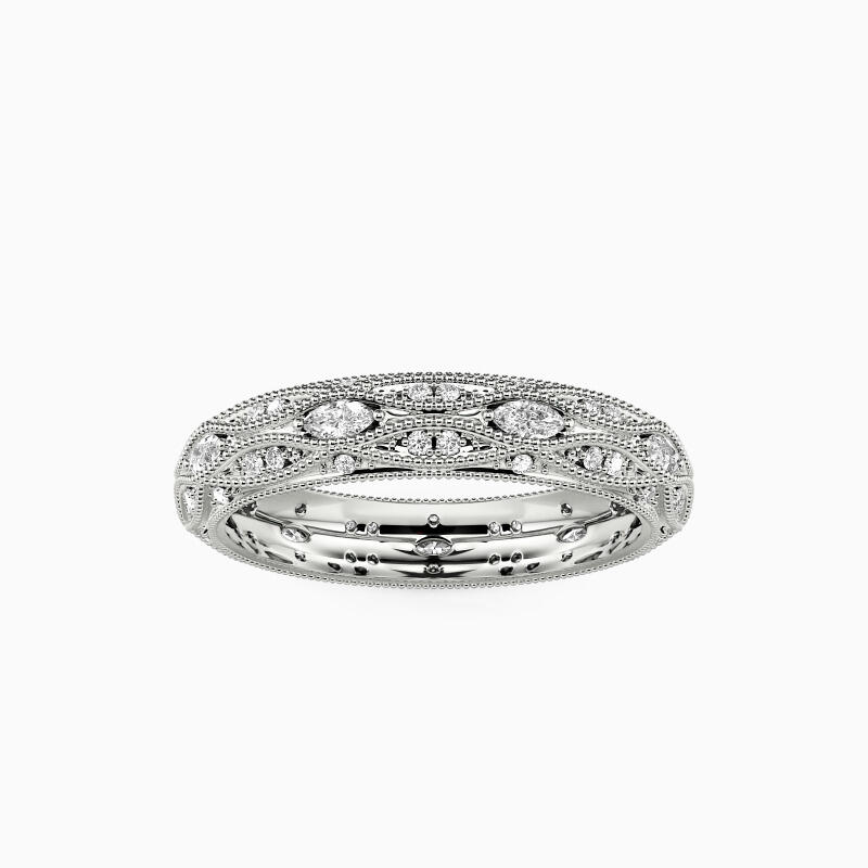 This eternity wedding band features glittering round-cut and marquise-cut alternatively studded on the band to exhibit superlative brilliance. Further enhancing the overall look of this ring is the milgrain borders, making it a gorgeous addition next to your engagement ring or to wear solo.