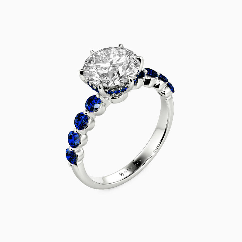 This exquisite engagement ring boasts a breathtaking round-cut center stone, perfectly set in a six-prong setting. The single-prong side stones complement this stunning center stone beautifully, leading exceptional brilliance to the ring. Its stunning design is further accentuated by the subtle hidden halo, which adds to the ring's beauty without overpowering its classic sophistication. This ring is a perfect choice for anyone looking to tastefully and stylishly showcase their commitment.
