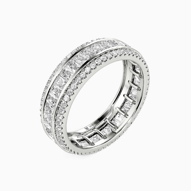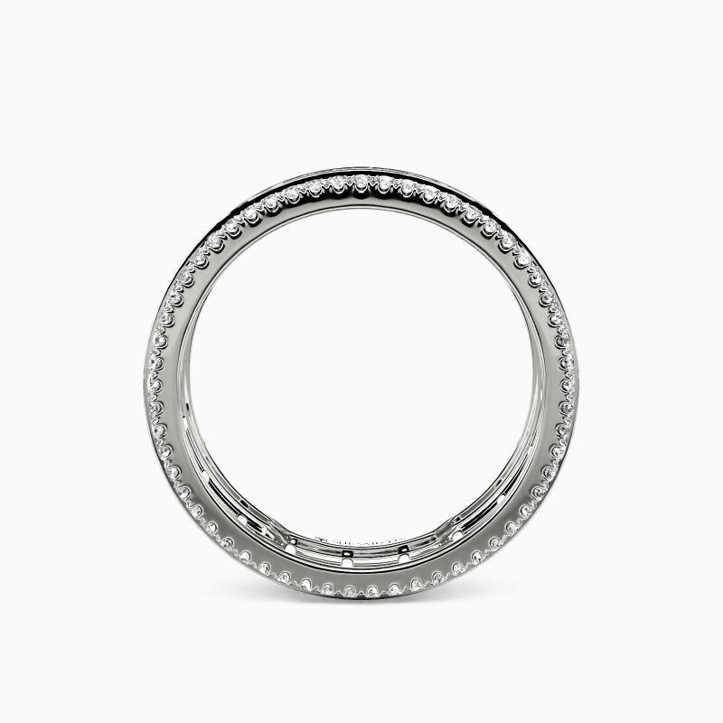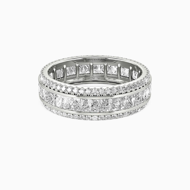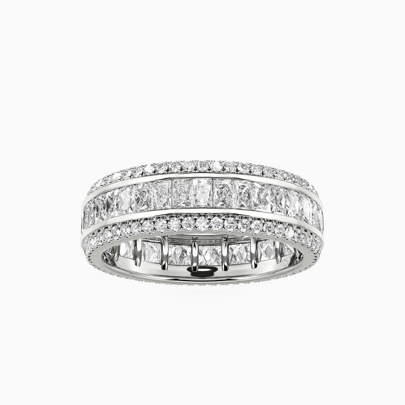 Maximum brilliance is what to expect from three rows of glittering accents presented in this eternity wedding band. The middle row of emerald-cut stones is set in a channel to show your flawless sparkle. And pavéd accents studded on the top and bottom edge further enhance its gorgeous look. I am so lucky to meet and fall in love with you, and I take this ring as my lifetime promise.