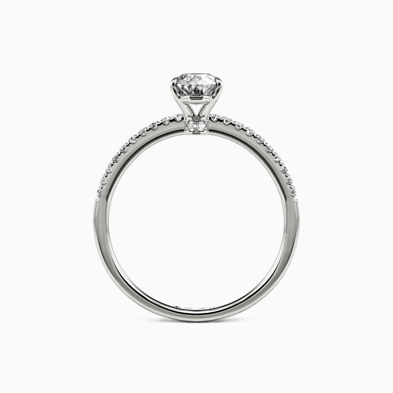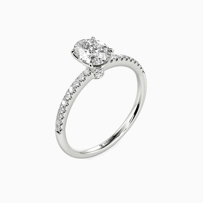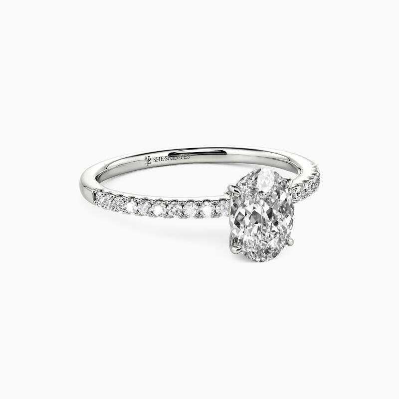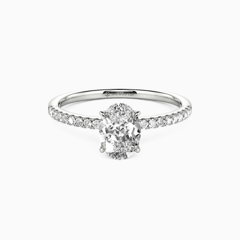 Stunning and exquisite, this engagement ring showcases a huge oval cut stone set up tall on the multiple surrounding side stones shank. Your eye will be immediately drawn to the brilliant oval cut center stone; a modern classic, it's certain to become a treasured favorite.