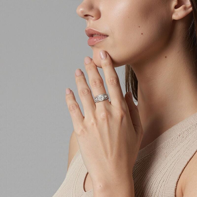 Hearkening classic bridal inspiration with fresh, whimsical femininity. The engagement ring showcases cushion-cut center stone framed by shimmering accent gems. Two marquise gems sit on the twist shank, small accent stones lining the sides added the additional sparkle. The contoured matching bands beautifully completes this wedding set for an eternal, 'I do.'