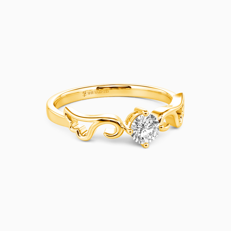 Featuring a pair of angel wings on each side of brilliant round center stone, this SHE·SAID·YES solitaire engagement ring is a study of timeless beauty and extreme attention to detail. It expresses the goodwill of angels and serves as a symbol of the world's greatest wishes of love.
