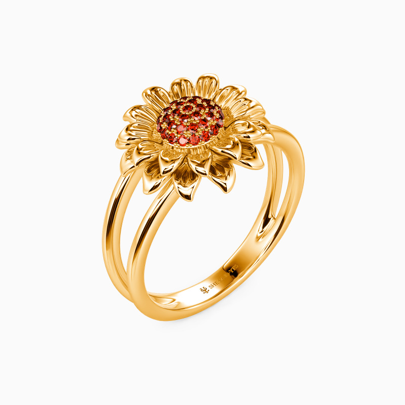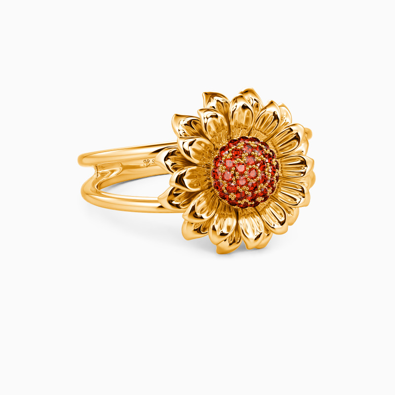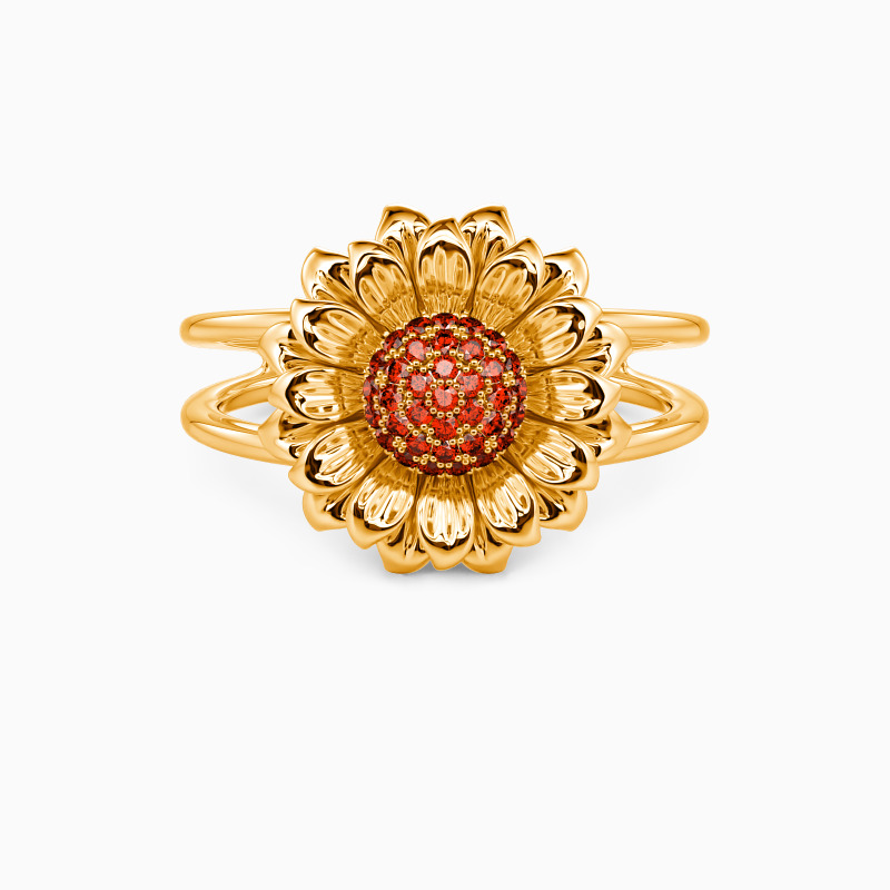 Add this exquisite floral ring to whatever you are wearing. It features a beautiful sunflower set on the split shank to evoke your natural appeal. Precious metal and vibrant inlaid accents add a splash of color to this trendy ring. Hope you can be bright sunny in your busy life with this ring.