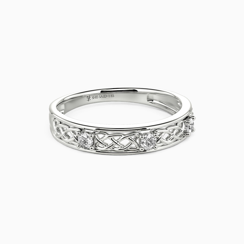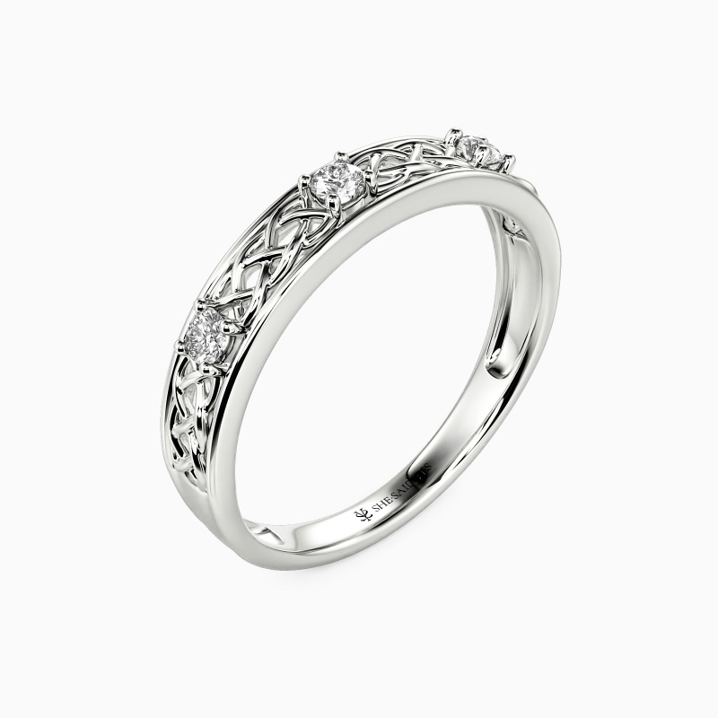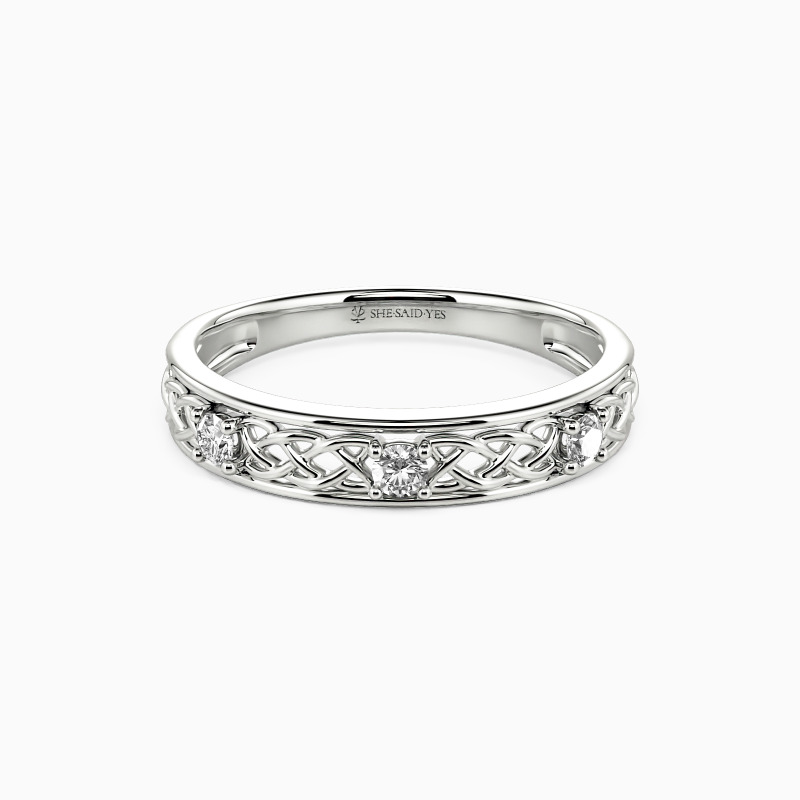 This stunning wedding band showcases three-pronged stones encrusted on a half hallow band. The rich-looking motifs add glitz and the stylish charm for the whole ring. Promise your love for a lifetime with this band, and she will come as you expected. Or you can choose to complete a splendid bridal set with it.