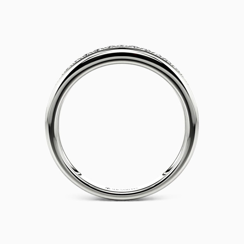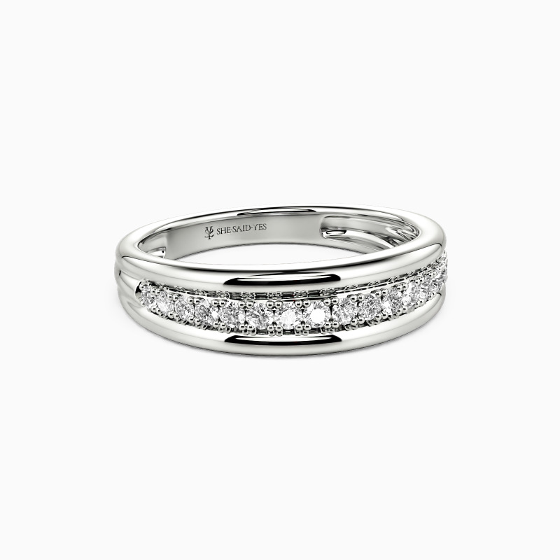A distinguished wedding band he'll treasure. This style showcases a row of pavéd round-cut stones glistening across the center. And the polished borders complete the sparkling design. It is certain to be a perfect choice for the man you adore.