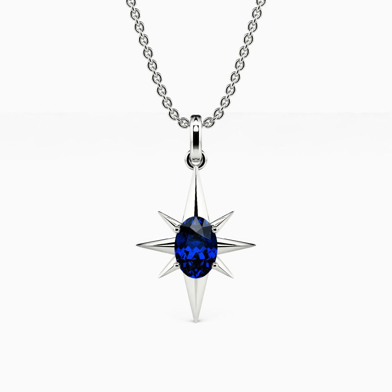 Chic and fabulous. This eight-point star pendant necklace symbolizes hope and guidance and is the ideal everyday accessory. It features a glimmering oval-cut gem in the center that emits the shining metallic rays from eight directions. This striking piece will lighten your day and save you from the darkness.