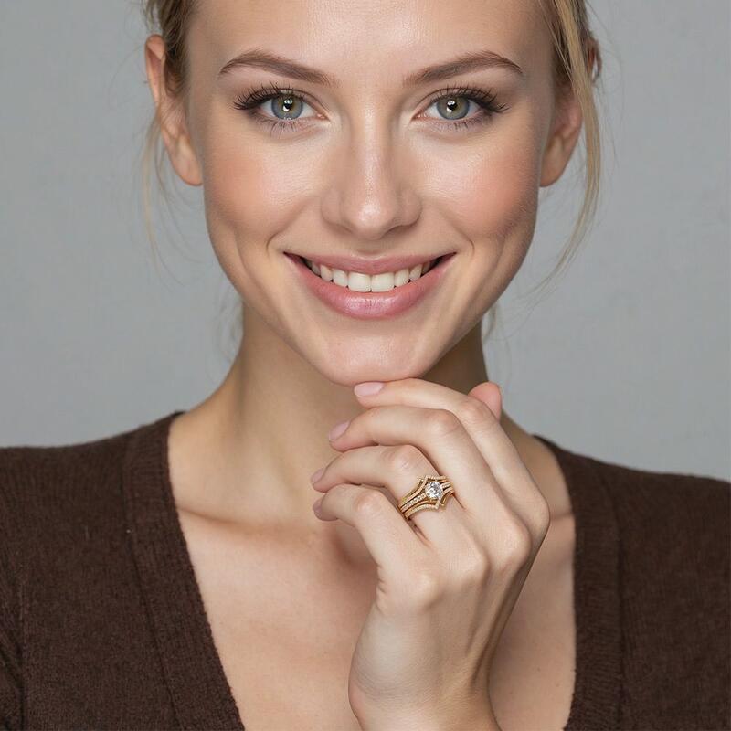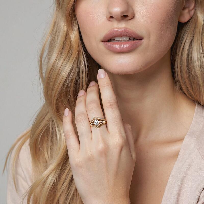 Romantic sense with endless elegance, this appealing artwork is ideal for everyone in love. Between the mountain silhouette of coordinating bands in shimmering pave, the center stone gleamed with its refined beauty, creating a magnificent glam of everlasting love. This attention-grabbing bridal set perfectly achieves every angels' dream.