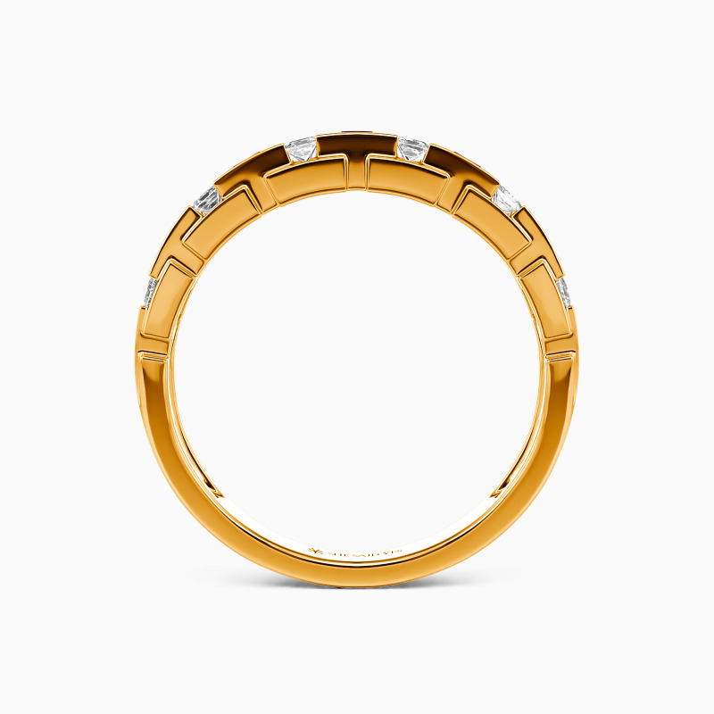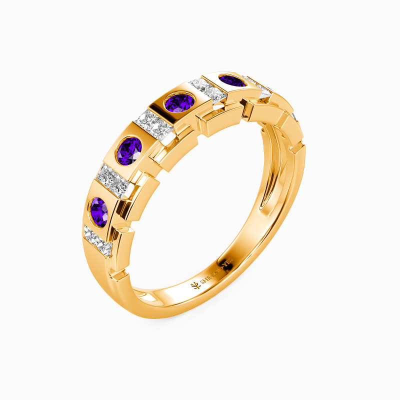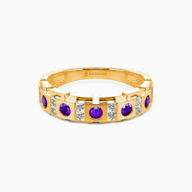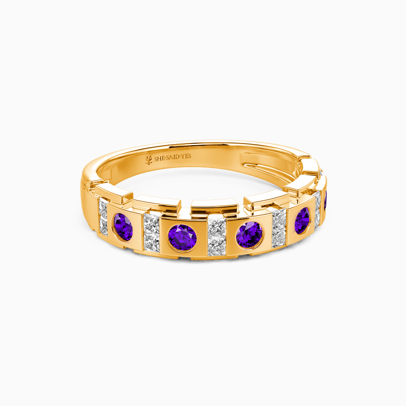 This men's band features small sparkling round-cut stones stud in a bezel setting on the square-designed shank. Embellished accents in a channel setting offer you extra splendor and charm. Love is you and me, and love is knowing we can be.