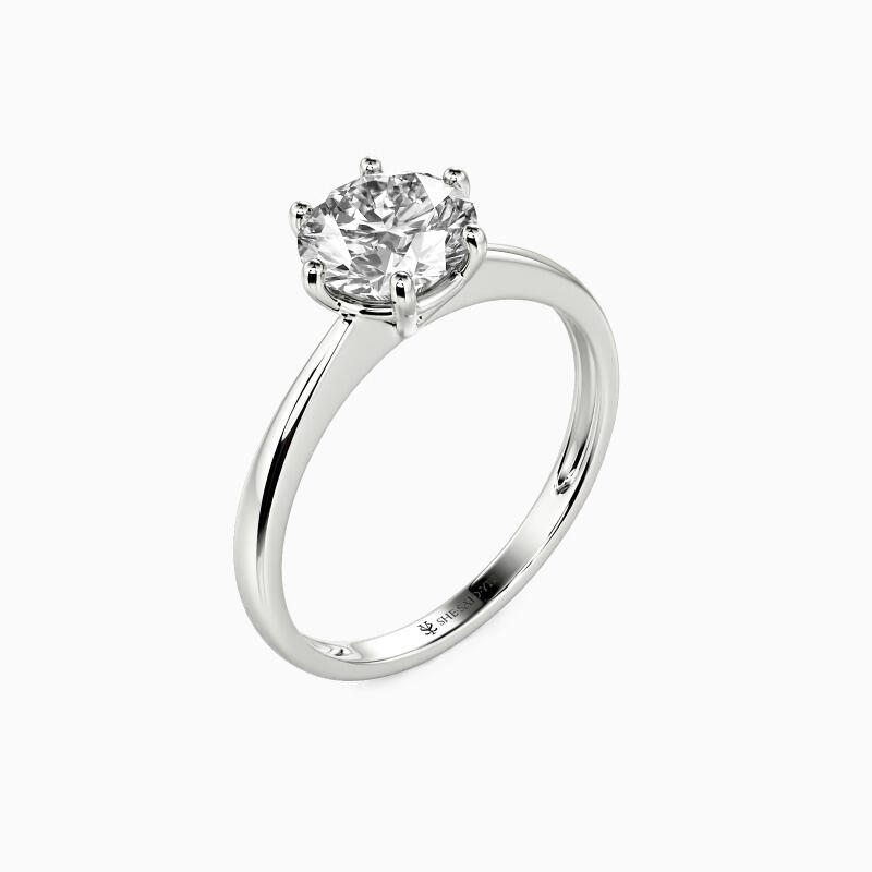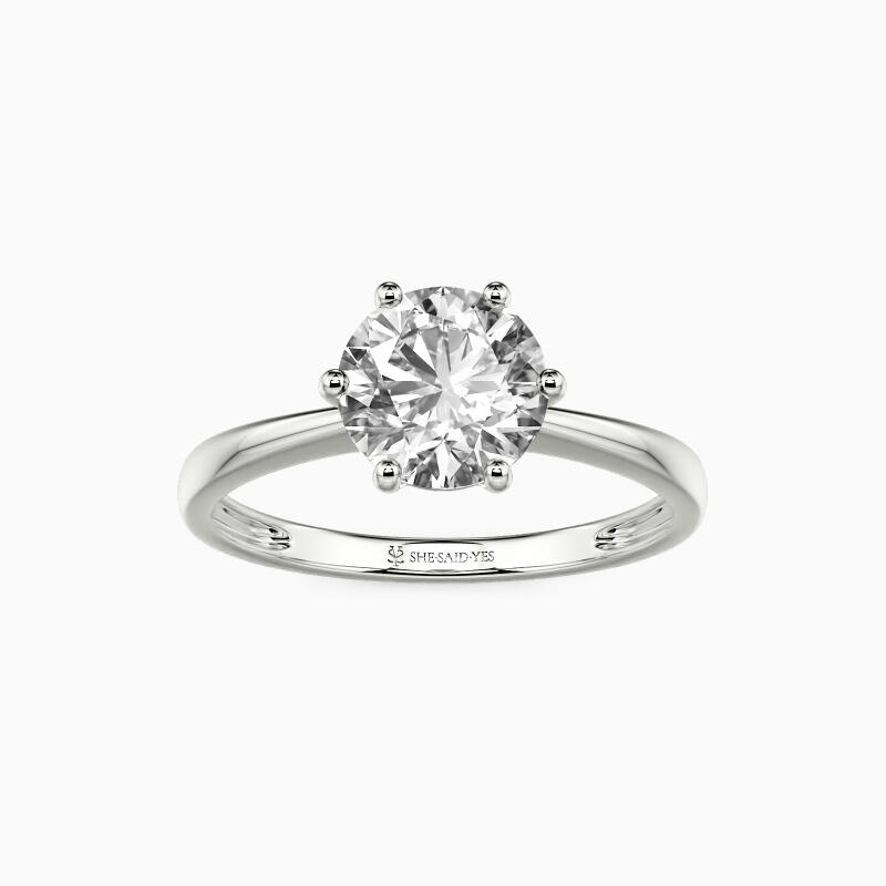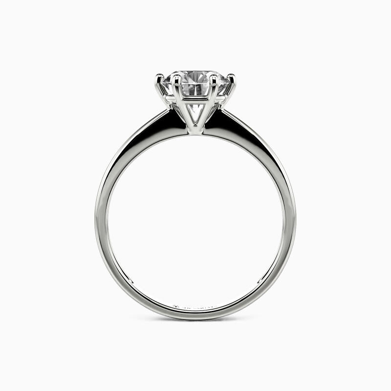 This brilliant six-prong solitaire features clean, finest lines and exquisitely tapered shoulders arching toward the center stone. With this solitaire design, you will forever be in that shine state of mind.