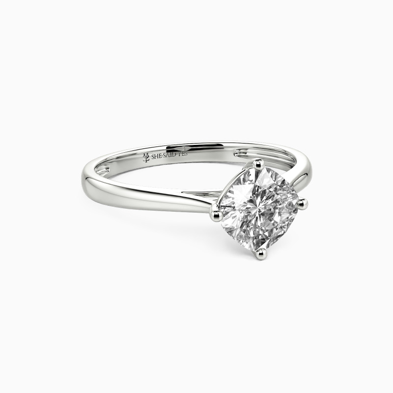 The four-prong setting gives a cushion-cut stone a fairly square look and allows more light to contact the stone, enhancing its brilliance. Give this ring to your beloved one to promise to be with her forever.