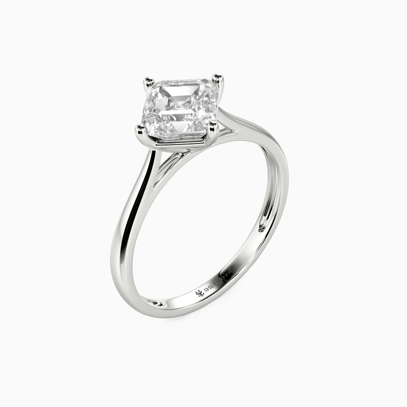 The four-prong setting gives an Asscher-cut stone a classic look and allows more light to contact the stone, enhancing its brilliance. Give this ring to your beloved one to promise to be with her forever.