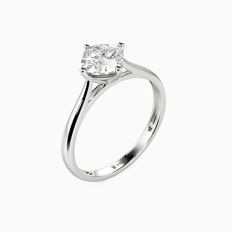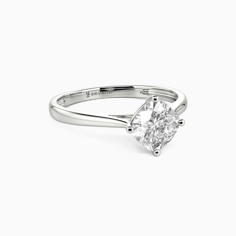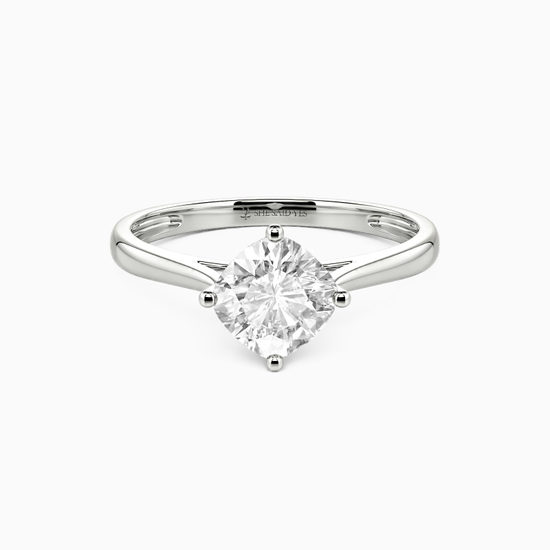The four-prong setting gives a cushion-cut stone a fairly square look and allows more light to contact the stone, enhancing its brilliance. Give this ring to your beloved one to promise to be with her forever.