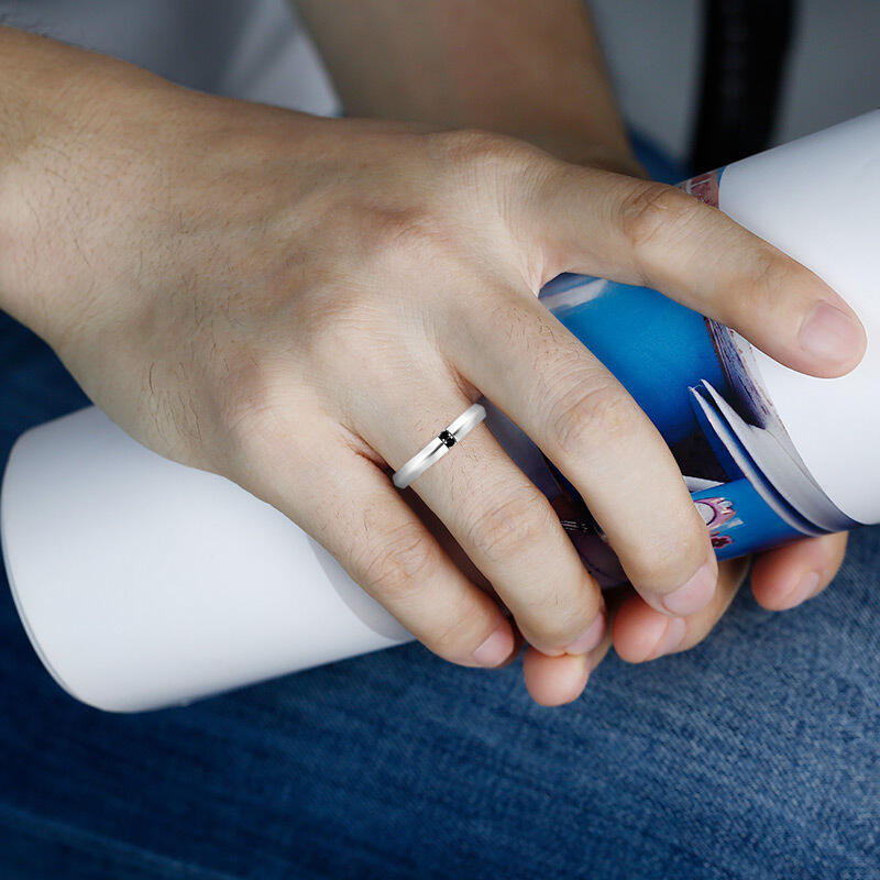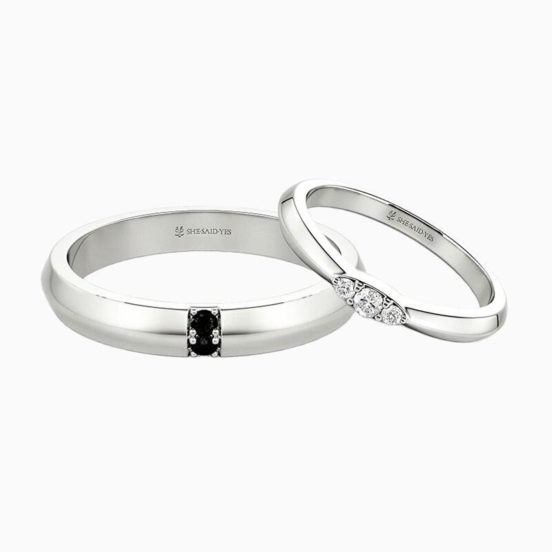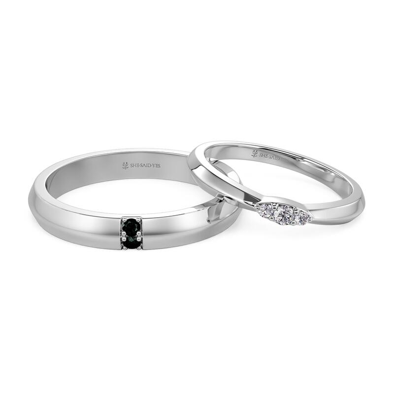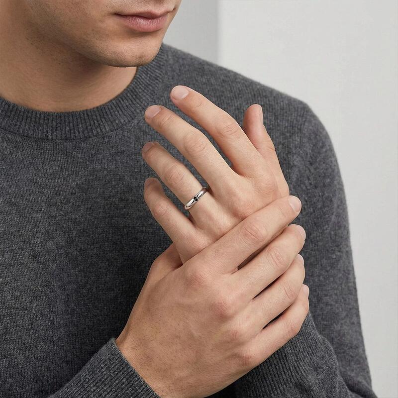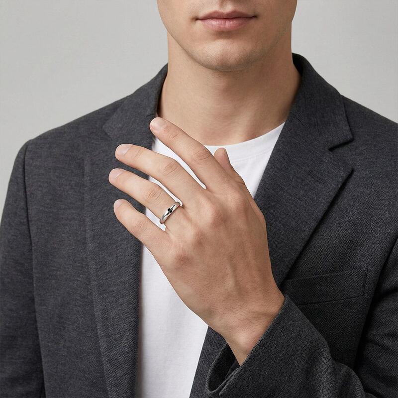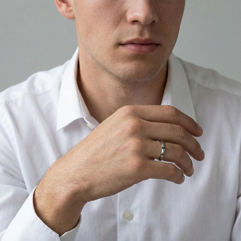 This bold men's wedding band features a sleek knife-edge design, exuding modern masculinity with its sharp, polished lines. Two perfectly set round gems add a touch of understated brilliance, creating a striking contrast against the refined metalwork. A timeless yet contemporary piece, it balances strength and sophistication for the discerning groom.