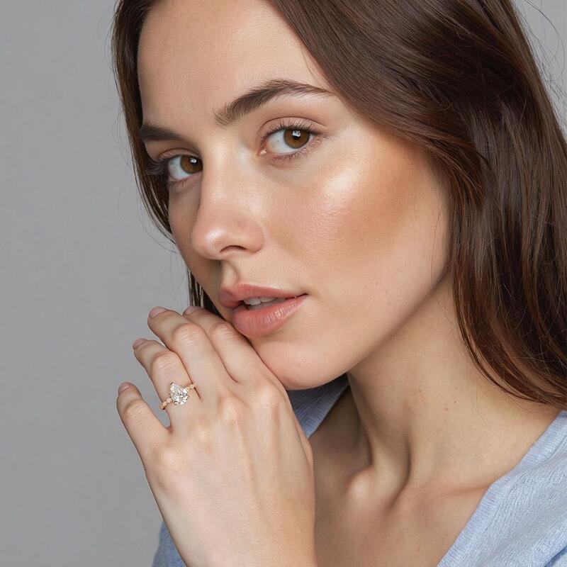 Exuding a subtle sparkle, this charming engagement ring features a twinkling pear-cut gemstone with a hidden halo surround. Along the tapered shank, a trio of tiny pear-shaped stones is lined with intricate milgrain detailing. It will be a ring they will cherish forever.