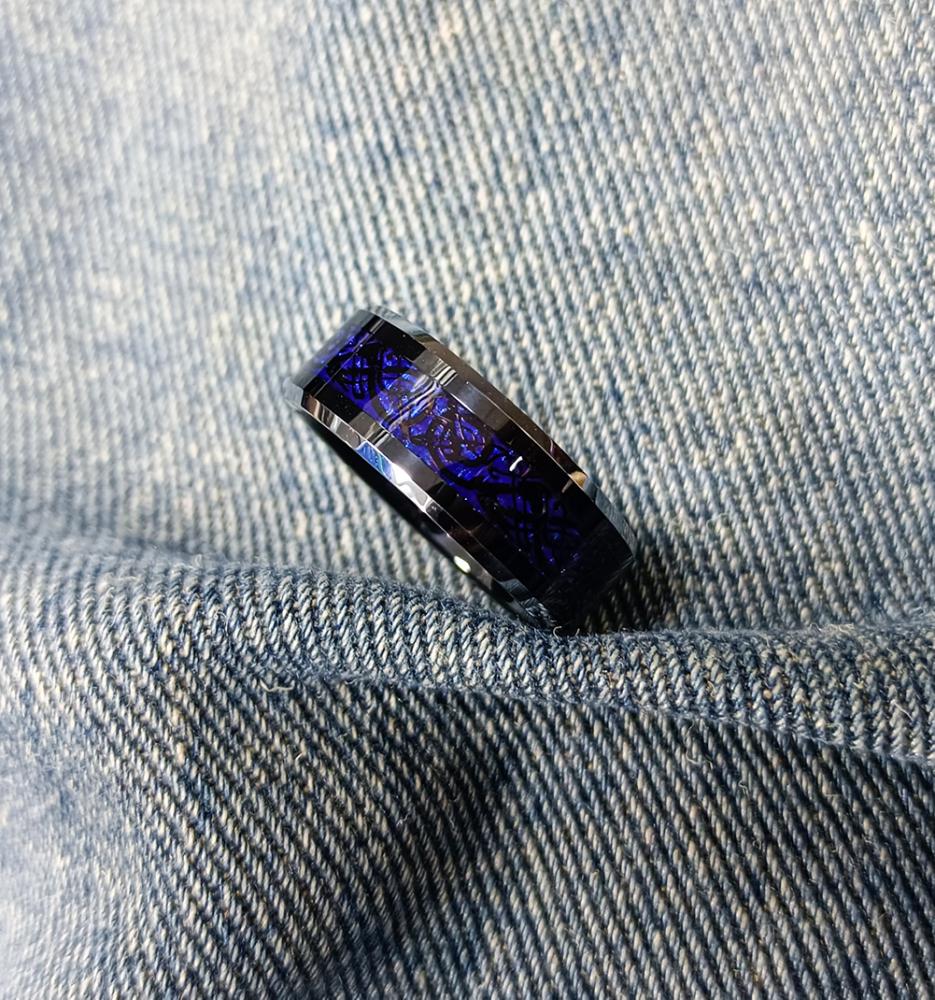 This striking men's wedding band showcases a Celtic dragon knot, a powerful symbol of strength, unity, and eternal connection, meticulously engraved into the design. The band is further enhanced with blue dragon scale sequins, adding a unique, eye-catching element that evokes the mystique and resilience of legendary dragons. The silver beveled edges provide a sleek, modern contrast, framing the band with refined elegance and ensuring it stands out with every movement.