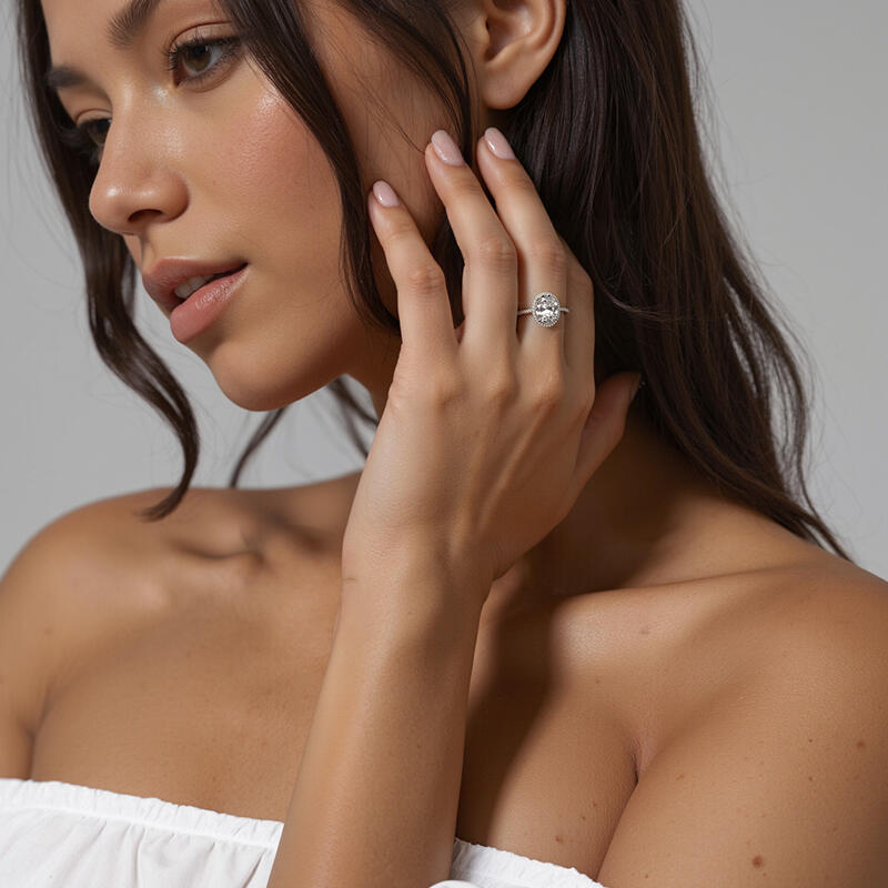 This oval halo has twinkly gemstones surrounding the brilliant center stone; the accents flow down each side of the shank. With its elegant design and sparkling stones, this ring is a beautiful complement to any attire.