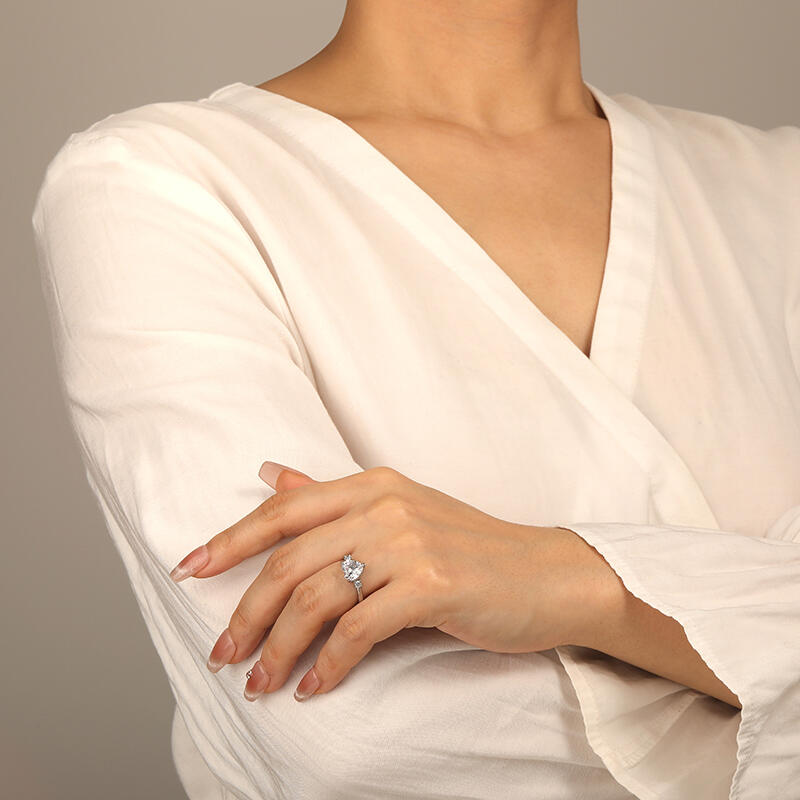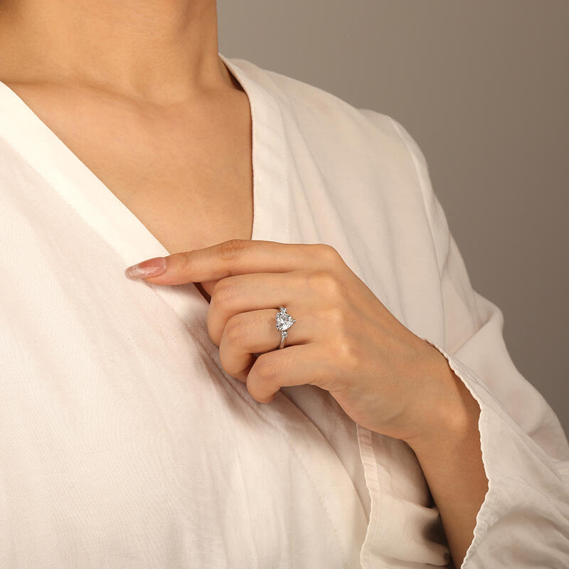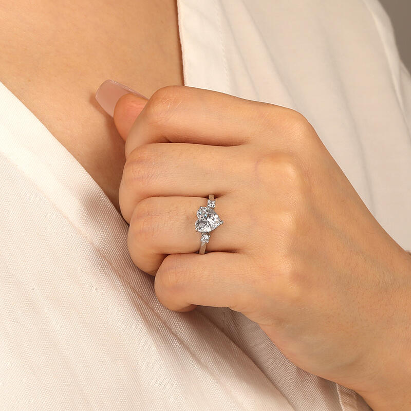 Simple yet glittering. This three-stone engagement ring boasts a sizable heart-cut center stone beautifully complemented by two round-cut side stones. The heart shape is a classic symbol of love, while the round-cut stones add dazzling sparkle. Crafted from precious metals, this ring is a timeless and elegant option for your proposal.