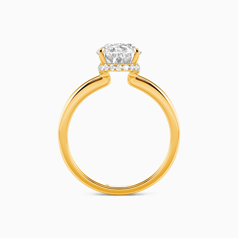 Exquisite craftsmanship shines in this engagement ring, featuring an oval-cut centerpiece that catches the light brilliantly. The setting's distinctive crown-like design adds a regal touch, with intricate detailing along the prongs. A sleek, high-polish band complements the elaborate top, creating a perfect fusion of simplicity and sophistication. This ring promises to be a treasured symbol of commitment.