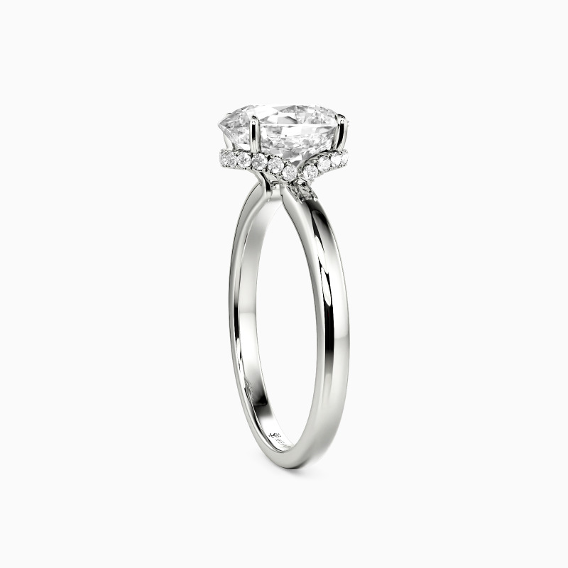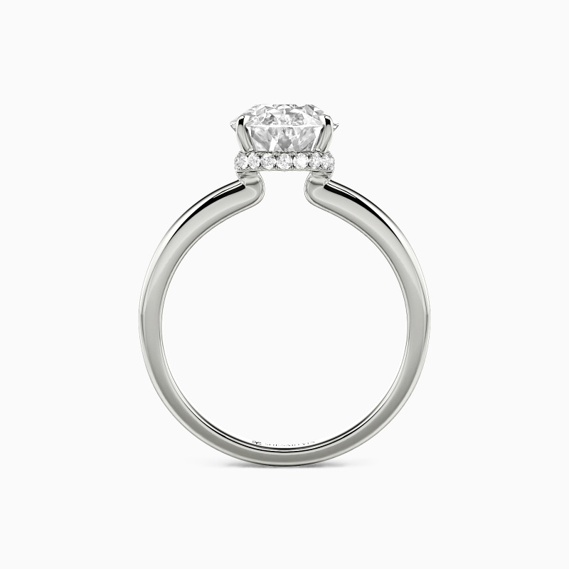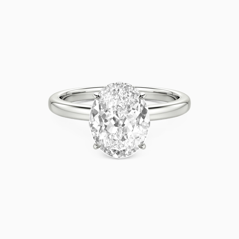 Exquisite craftsmanship shines in this engagement ring, featuring an oval-cut centerpiece that catches the light brilliantly. The setting's distinctive crown-like design adds a regal touch, with intricate detailing along the prongs. A sleek, high-polish band complements the elaborate top, creating a perfect fusion of simplicity and sophistication. This ring promises to be a treasured symbol of commitment.