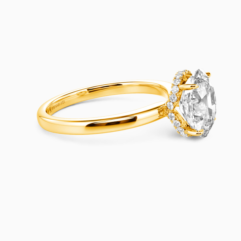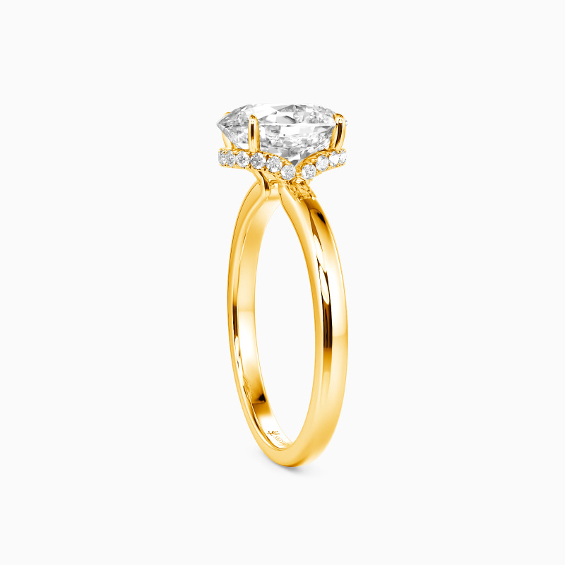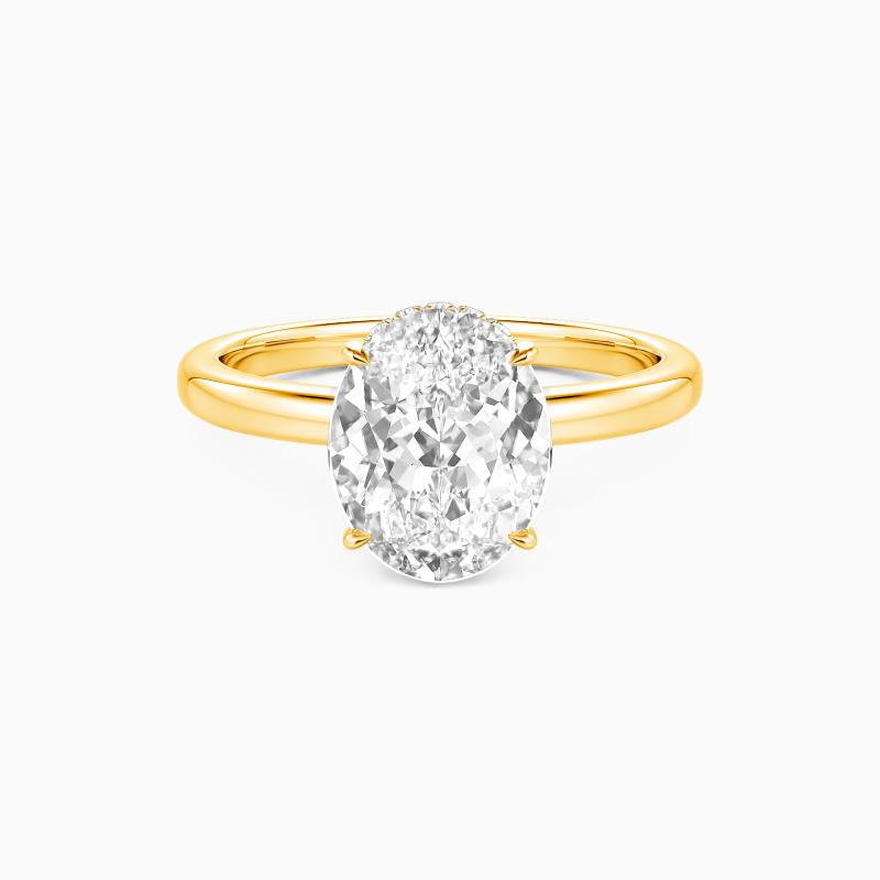 Exquisite craftsmanship shines in this engagement ring, featuring an oval-cut centerpiece that catches the light brilliantly. The setting's distinctive crown-like design adds a regal touch, with intricate detailing along the prongs. A sleek, high-polish band complements the elaborate top, creating a perfect fusion of simplicity and sophistication. This ring promises to be a treasured symbol of commitment.