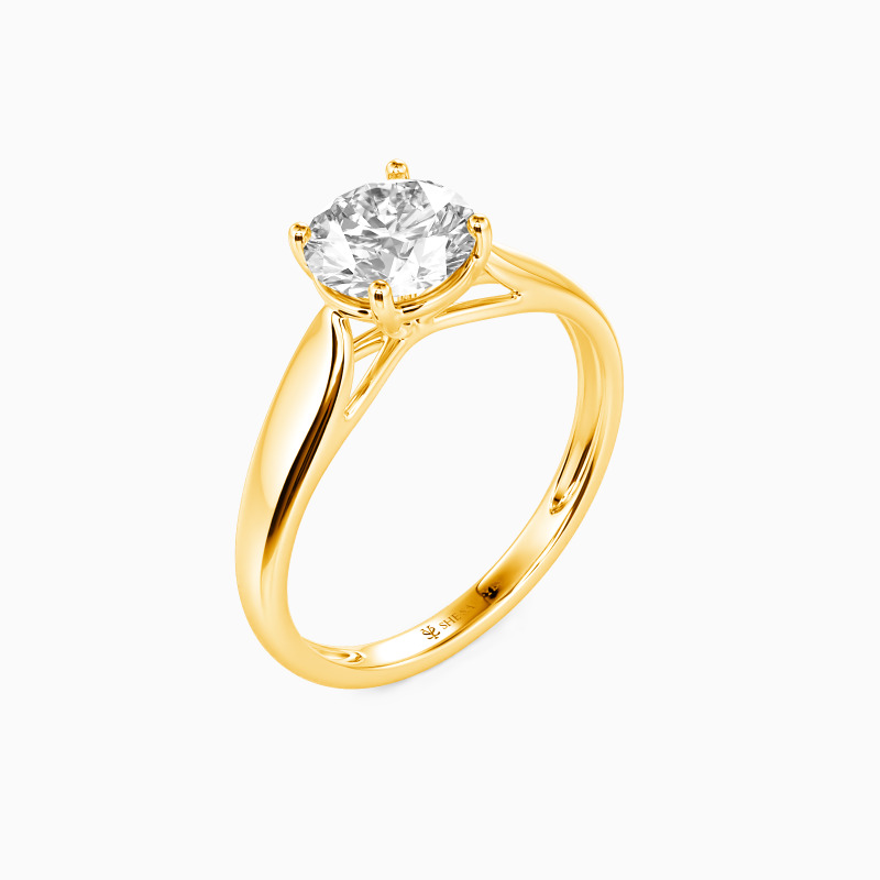 As scripture as it gets. This engagement ring features a Round cut Stone set high above the simple band. The look is very traditional, with clean lines and nothing to distract from the beauty.