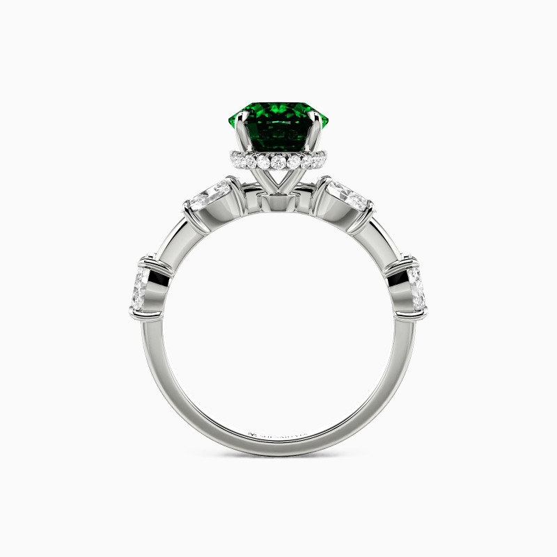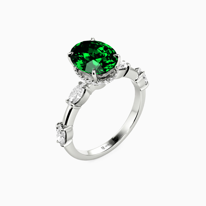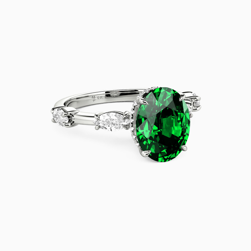 Captivating and elegant, this engagement ring features a stunning oval-cut center stone, beautifully enhanced by a hidden halo that amplifies its brilliance. Graceful marquise side stones embrace the center, creating a leaf-like silhouette that symbolizes growth and new beginnings. This piece perfectly balances timeless romance with modern sophistication, adding depth and beauty to your love story.
