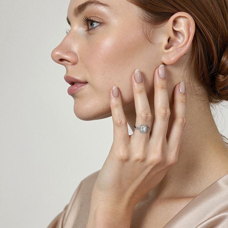 Timeless and stunning. This engagement ring features a radiant-cut center stone with exquisite brilliance and charm. The halo surrounding the center stone emphasizes its radiance and accentuates the ring's graceful design, making it an ideal choice for an ethereal bride. Moreover, two intertwined ribbons delicately emphasize the ring's elegant contours, perfectly complementing the center stone. This engagement ring is the ultimate embodiment of love, making it an unforgettable and cherished symbol of your devotion.