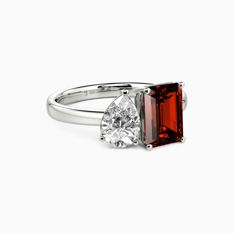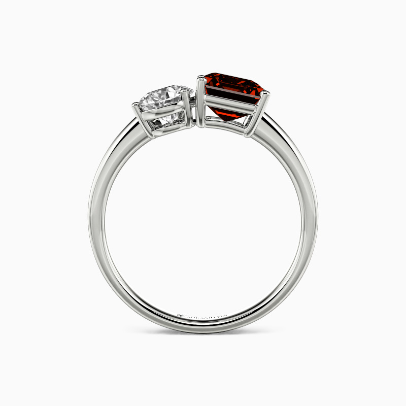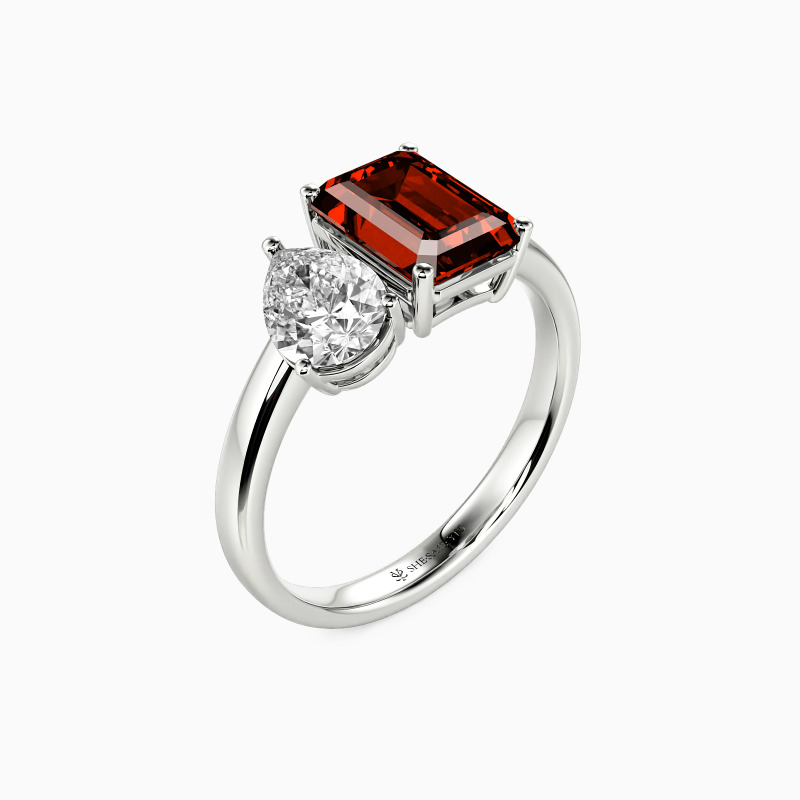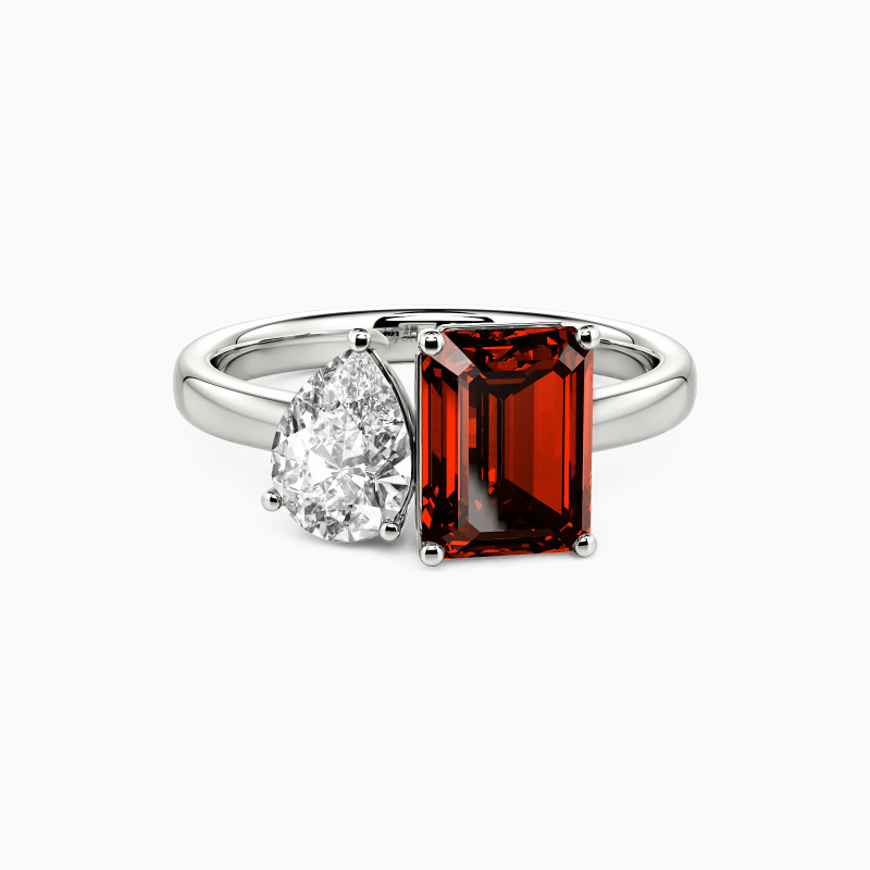 Two stones, an emerald cut and a pear cut, coexist harmoniously in the 'toi et moi' ring. Their unique cuts offer a captivating visual contrast. The smooth finish of the buffed shank adds to the overall comfort. Symbolizing a beautiful union of two hearts, this ring tells a unique love story. Its timeless design and meaningful symbolism make it more than just a piece of jewelry.