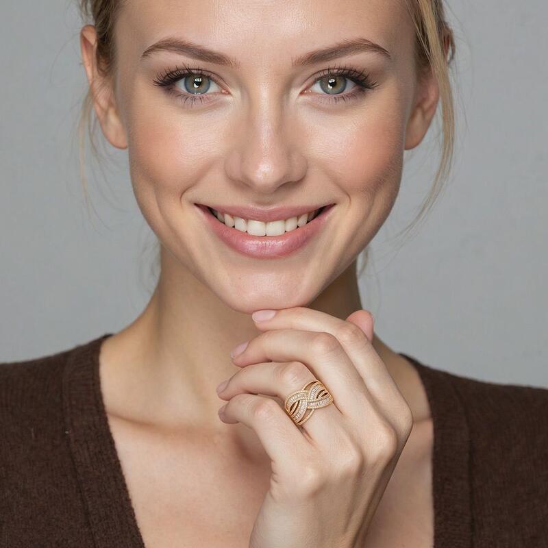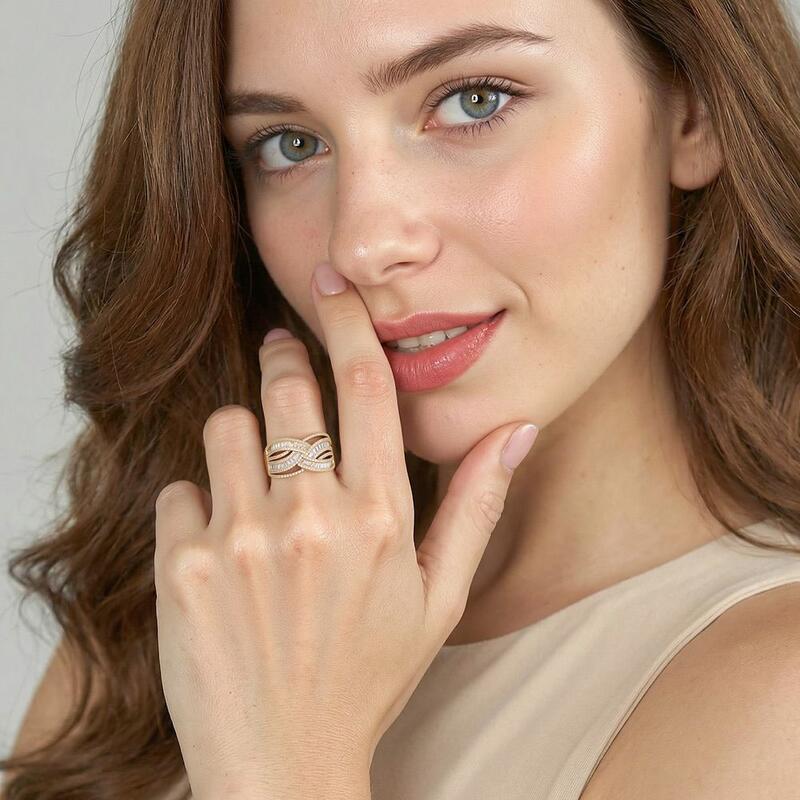A masterfully crafted statement ring featuring an intricate crossover design that symbolizes the eternal interweaving of love. Delicate baguette stones cascade in graceful curves, harmoniously complemented by round-cut gems that trace the ring's flowing silhouette. This sophisticated piece creates a mesmerizing play of light with its artfully arranged stones.