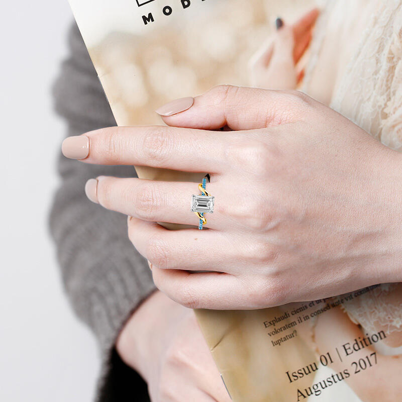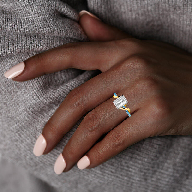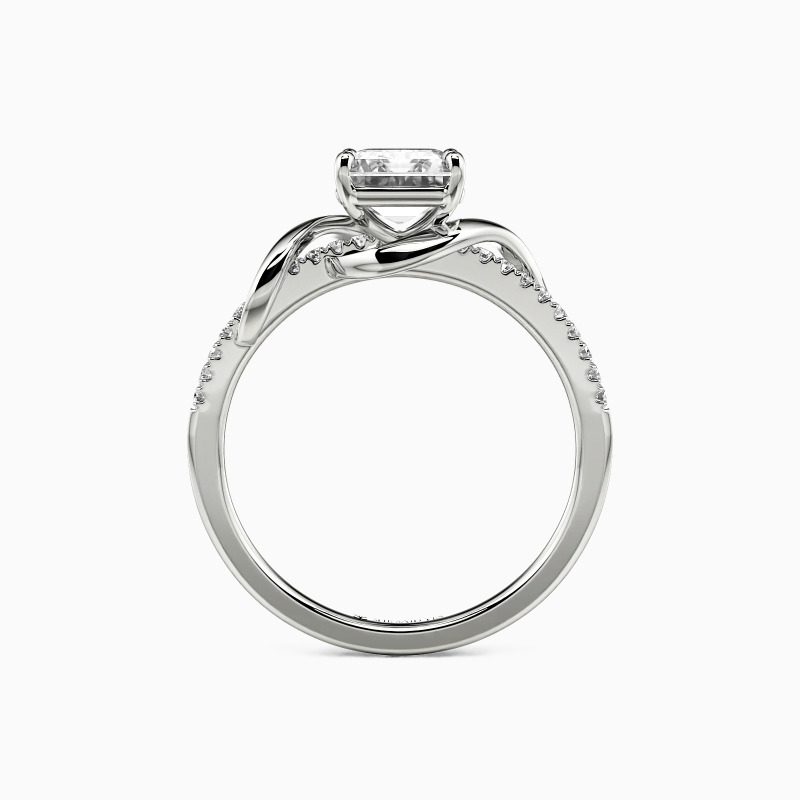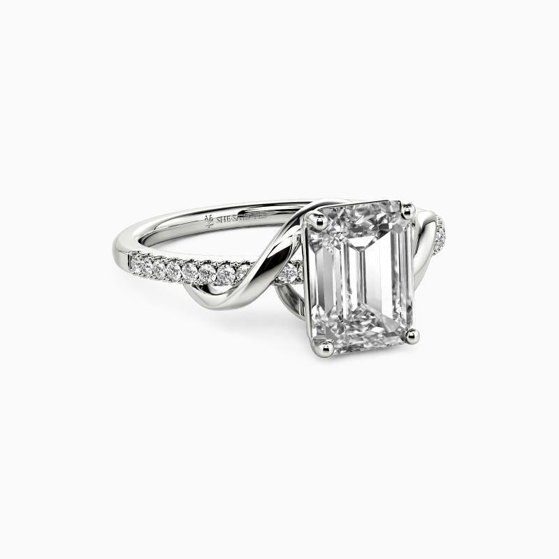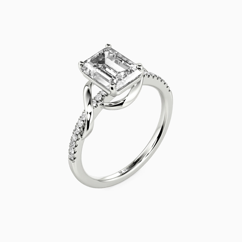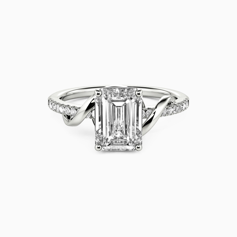 This side-stone engagement ring exudes elegance with an emerald-cut centerpiece, beautifully embraced by a smooth metal ribbon. The design twists and turns, leading to a meticulously paved shank, creating a journey of sparkle. A symbol of enduring love, this ring is a romantic testament to a story yet to unfold.