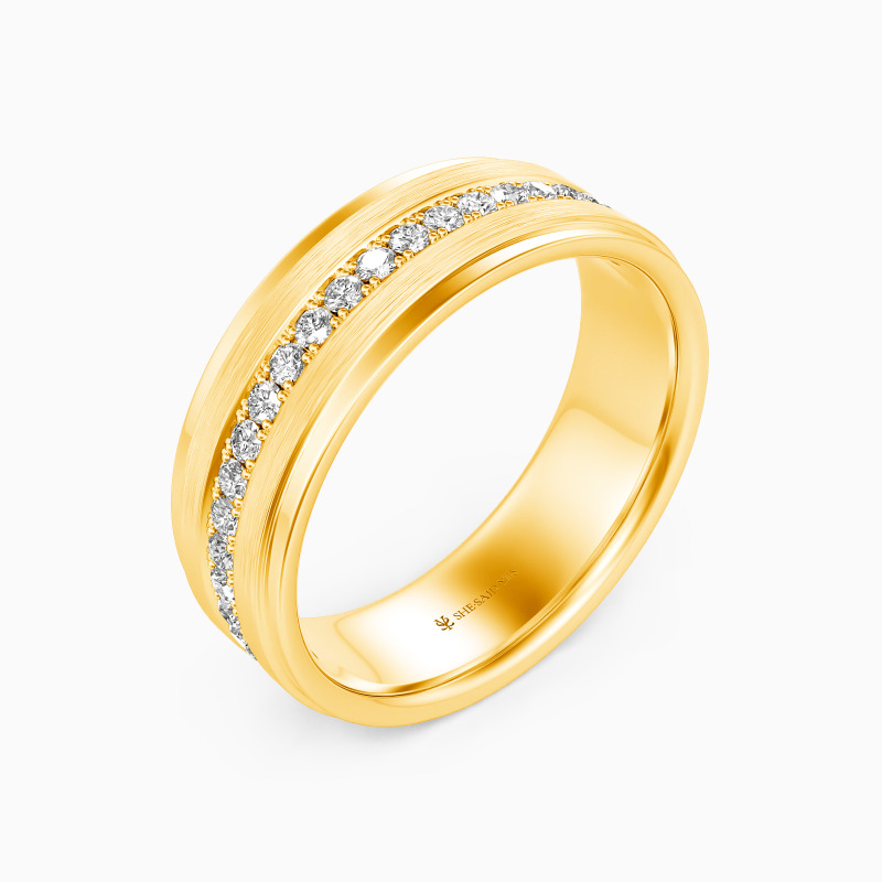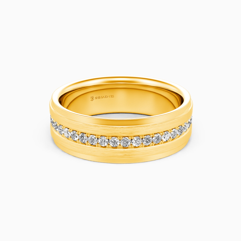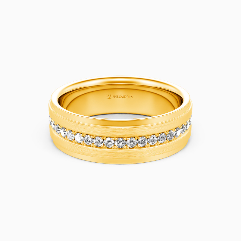 Depict an on-trendy style with precious metal and unique design; A row of shimmering round gemstones is spread across the band, with a sleek brushed finish accented alongside for a further level of sophistication. This dreamy eternity wedding band incorporates the ultimate craftsmanship for your ideal wedding.