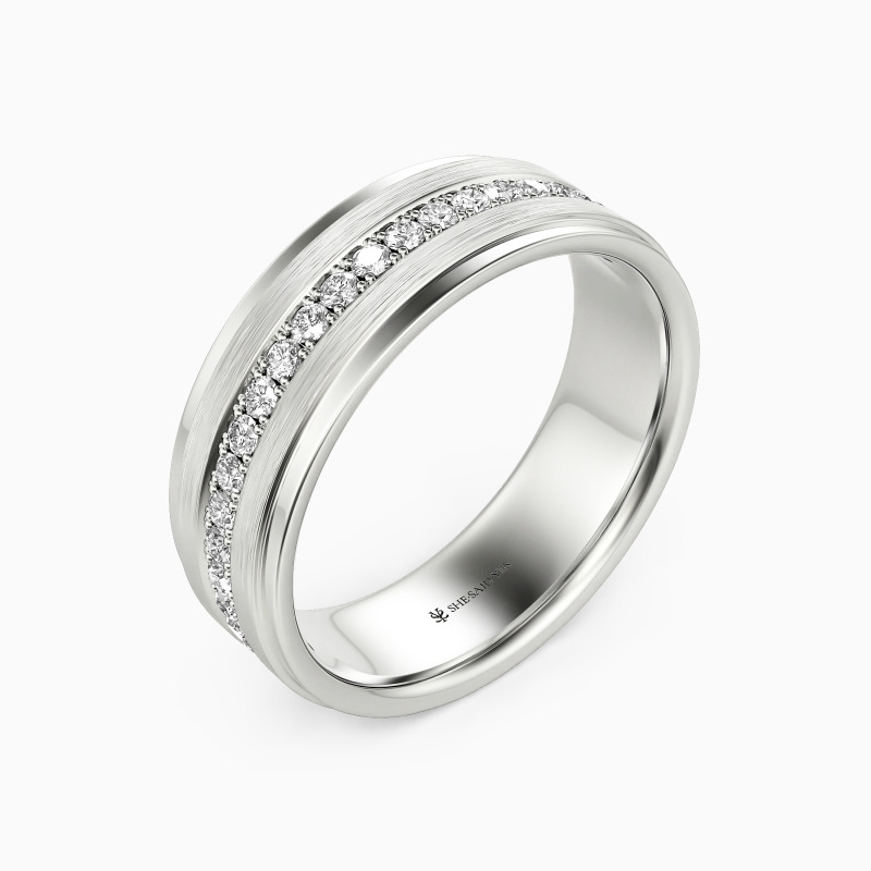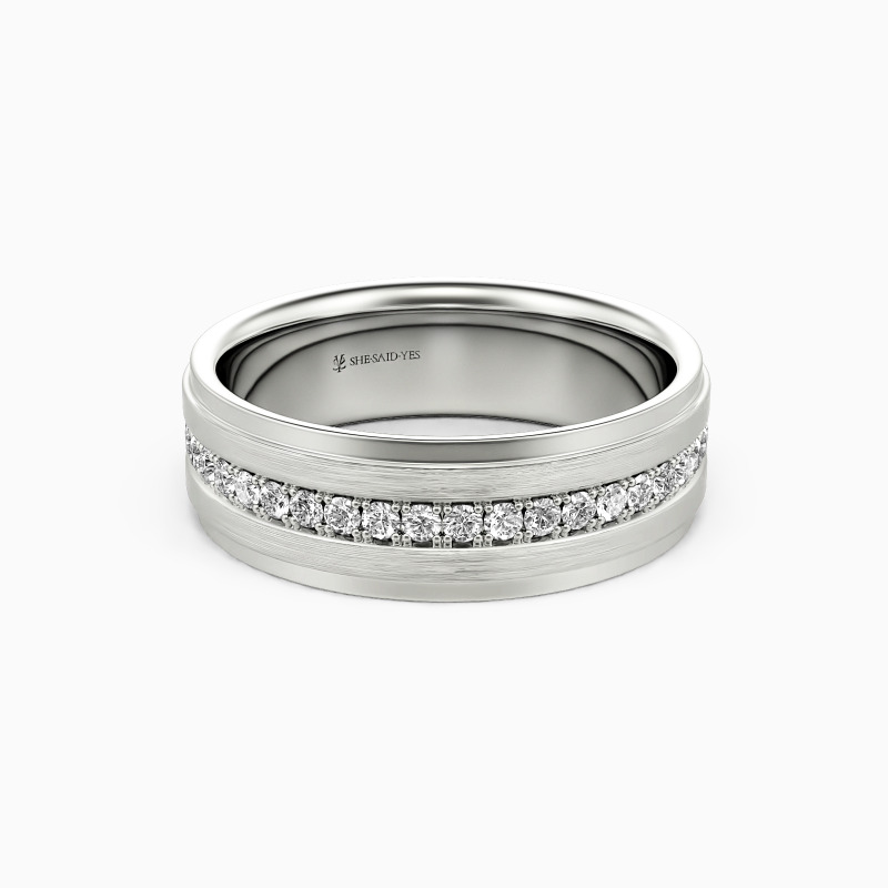 Depict an on-trendy style with precious metal and unique design; A row of shimmering round gemstones is spread across the band, with a sleek brushed finish accented alongside for a further level of sophistication. This dreamy eternity wedding band incorporates the ultimate craftsmanship for your ideal wedding.
