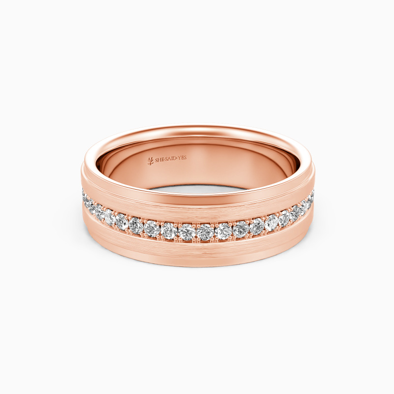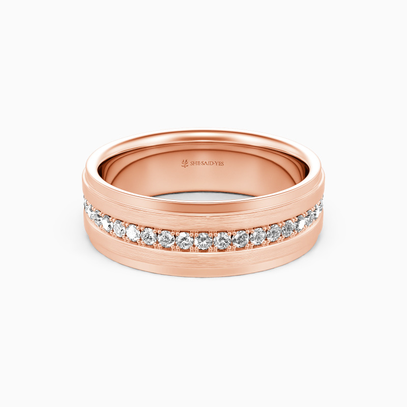 Depict an on-trendy style with precious metal and unique design; A row of shimmering round gemstones is spread across the band, with a sleek brushed finish accented alongside for a further level of sophistication. This dreamy eternity wedding band incorporates the ultimate craftsmanship for your ideal wedding.