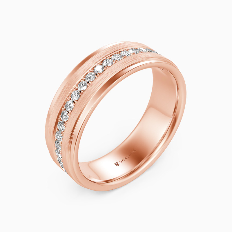 Depict an on-trendy style with precious metal and unique design; A row of shimmering round gemstones is spread across the band, with a sleek brushed finish accented alongside for a further level of sophistication. This dreamy eternity wedding band incorporates the ultimate craftsmanship for your ideal wedding.